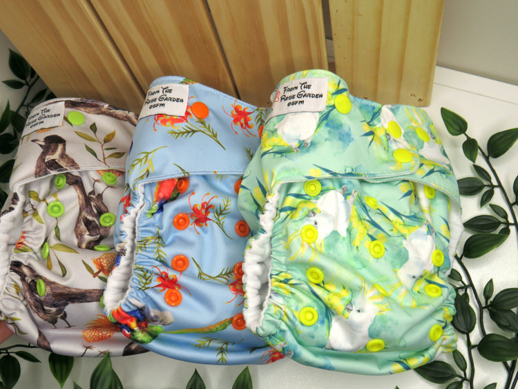 Our Double row front snapping cloth nappies are an All-In-Two style with 4 rise settings and are designed to fit from birth to toilet training (4-20kgs). Each nappy comes with a long bamboo snake insert and a smaller bamboo booster which is topped with suede cloth (a stay dry layer), which is all you need to give yourself a good start with your cloth nappy journey.