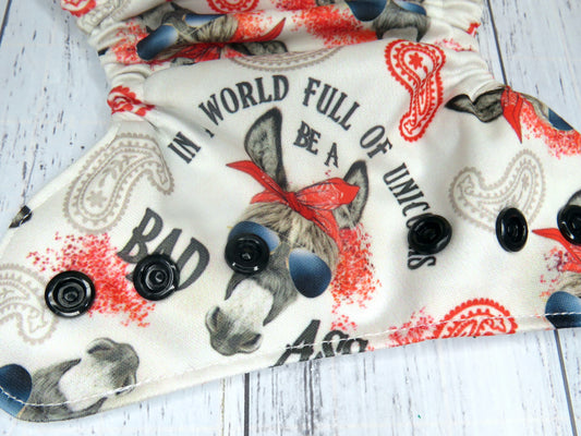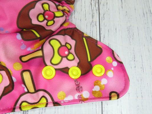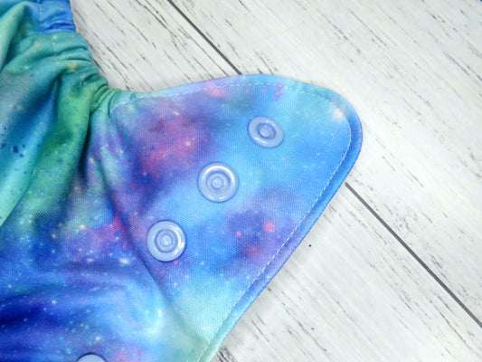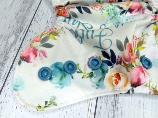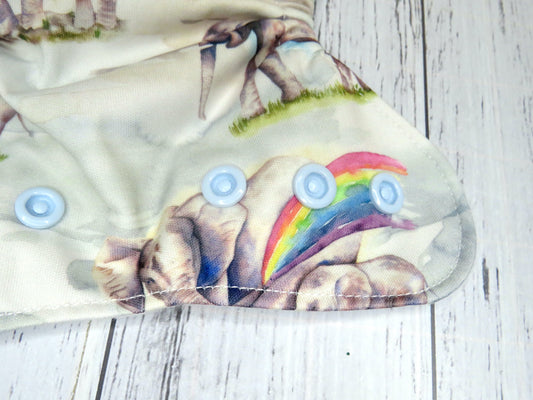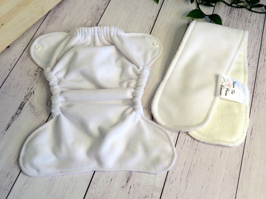 The outer layer of these nappies is either minky or PUL with a suede cloth inner, the insert is a fold over snake style insert composed of bamboo and topped with suede cloth to keep bub feeling nice and dry.