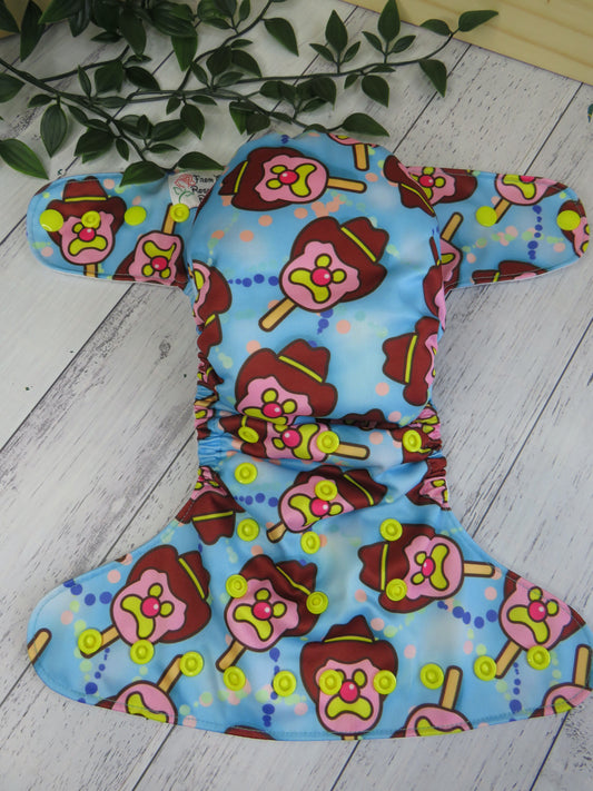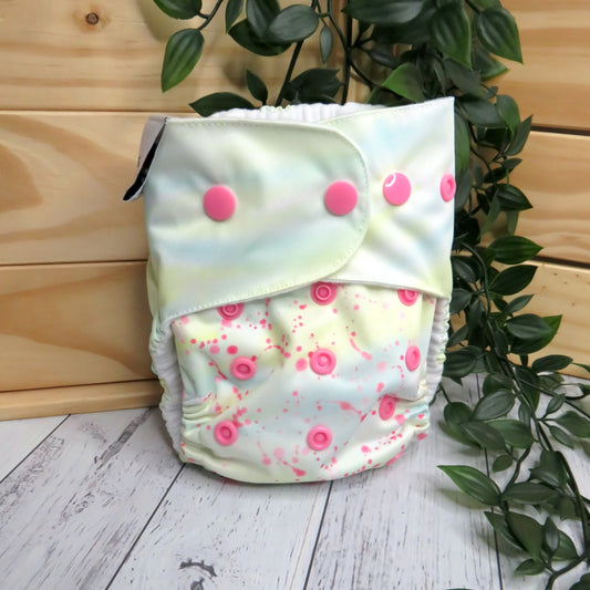 It is a front snapping nappy with a single row of waist snaps, that fits from approx. 3-17kgs. They are an all in 2 snap in nappy, this means the inserts snap into the shell.