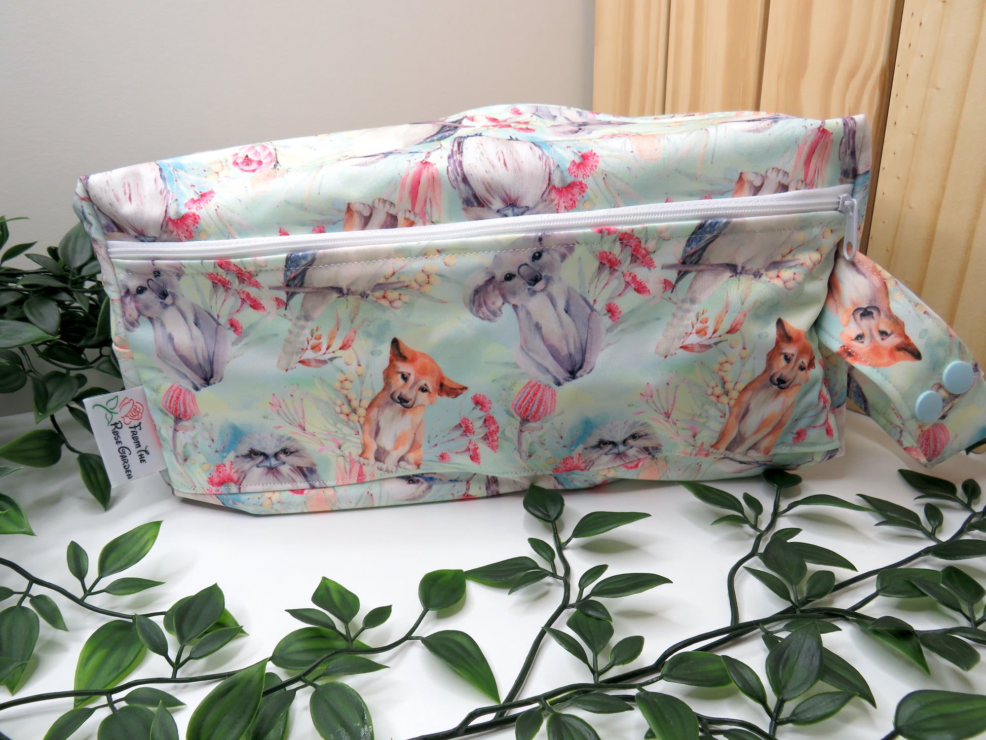 Our nappy pods are a rectangular box shape that can comfortably fit 6 of our nappies, depending on which size you buy. They are perfect for short day trips, add in 3 nappies, some wipes, a change of pants and off you go. They are amazing to send to daycare, just stuff full of your clean nappies and single nappy wetbags and off you go!