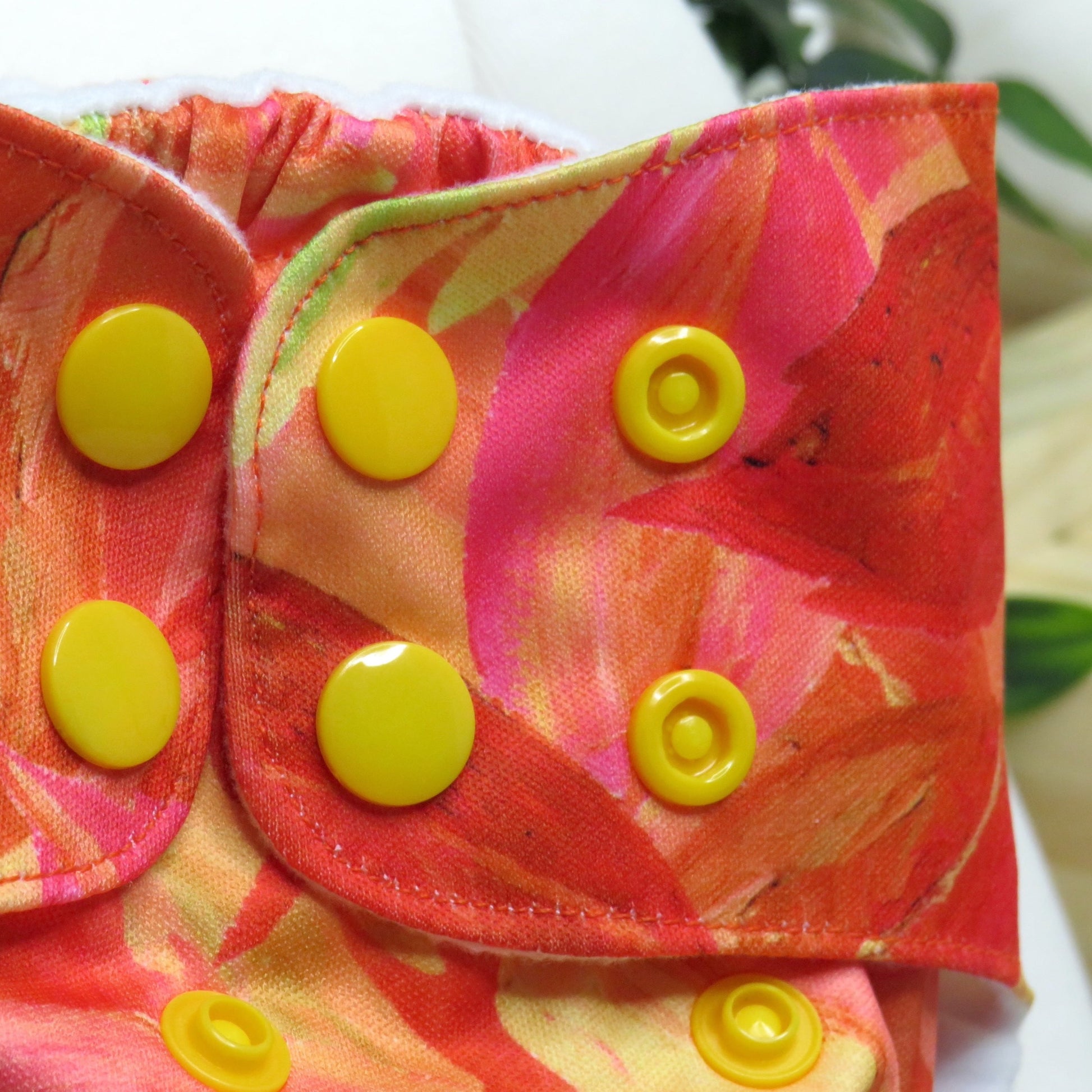 Our Double row front snapping cloth nappies are an All-In-Two style with 4 rise settings and are designed to fit from birth to toilet training (4-20kgs).