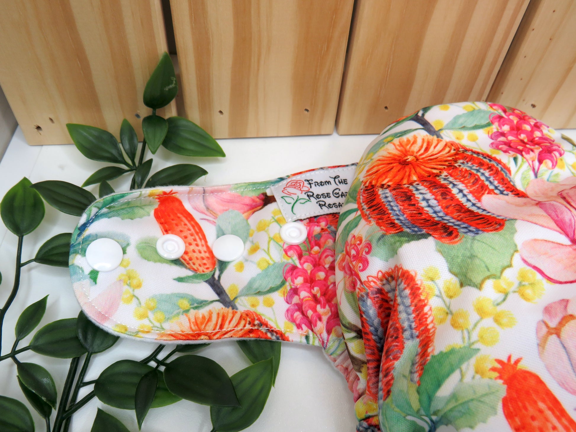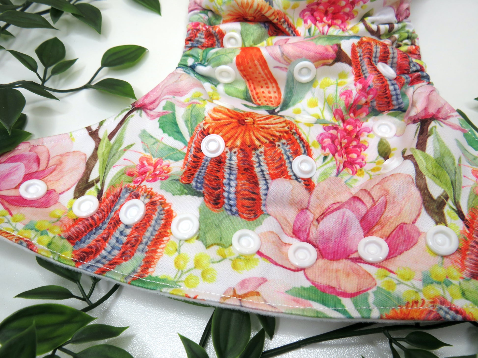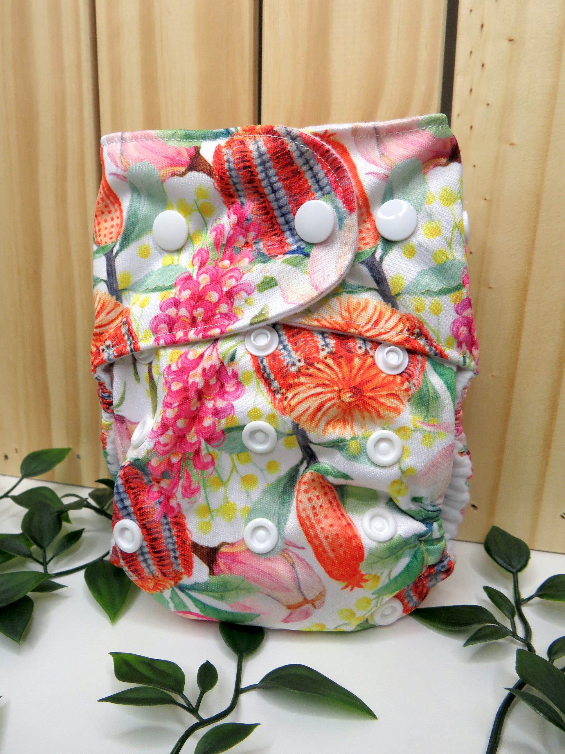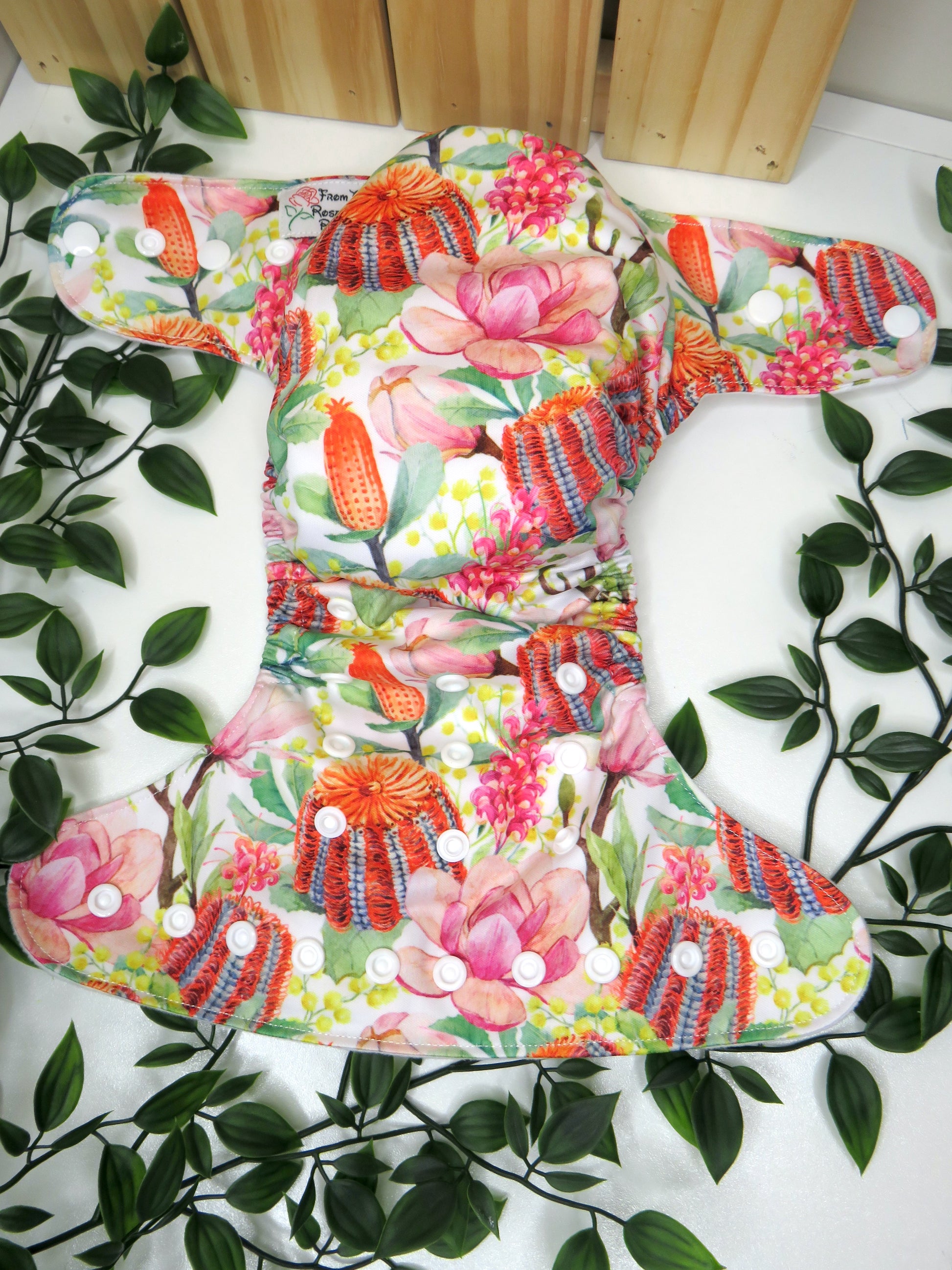 Each nappy comes with a snap in bamboo insert topped with suede cloth and a long bamboo snake insert that can be folded for where the absorbency is needed.