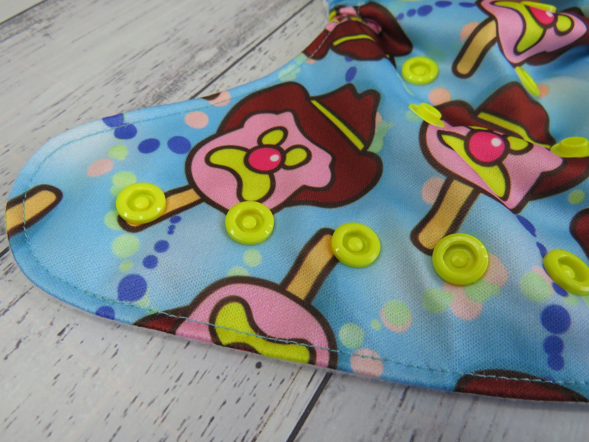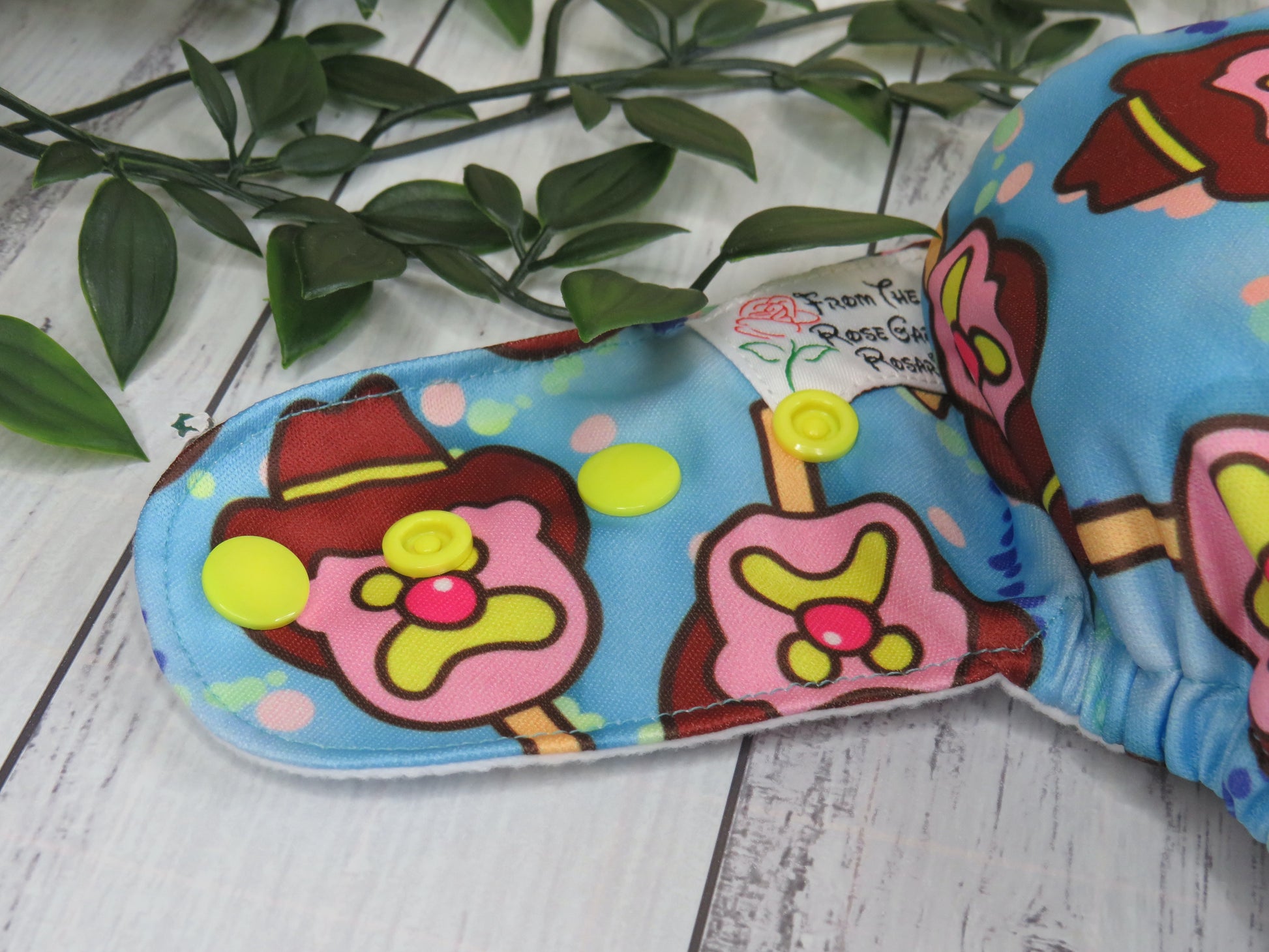Each nappy comes with a snap in bamboo insert topped with suede cloth and a long bamboo snake insert that can be folded for where the absorbency is needed.