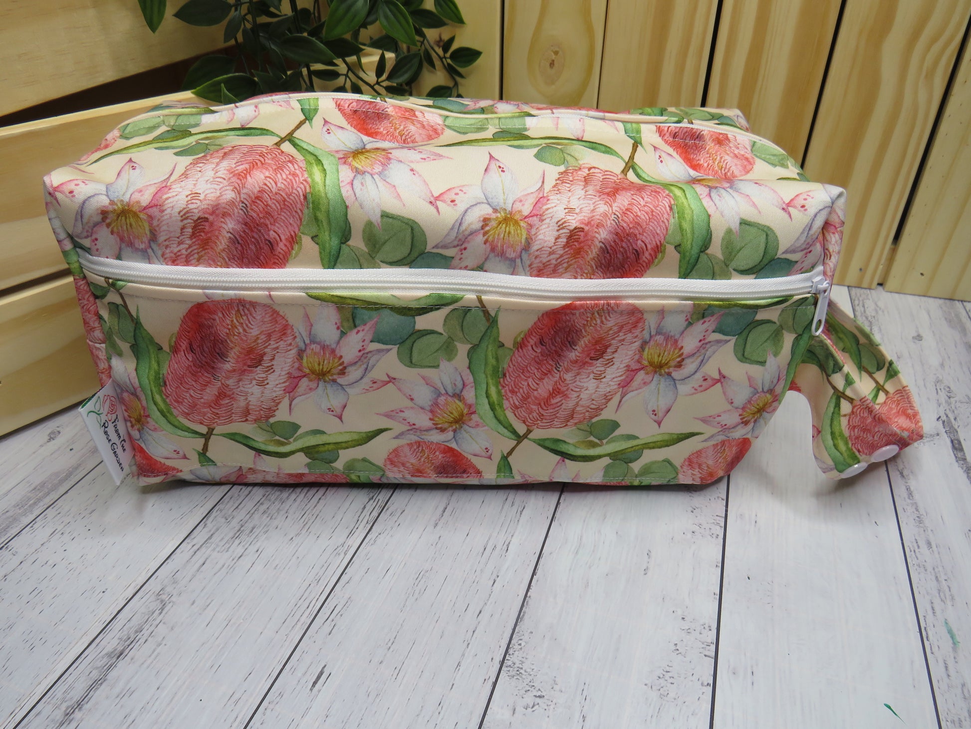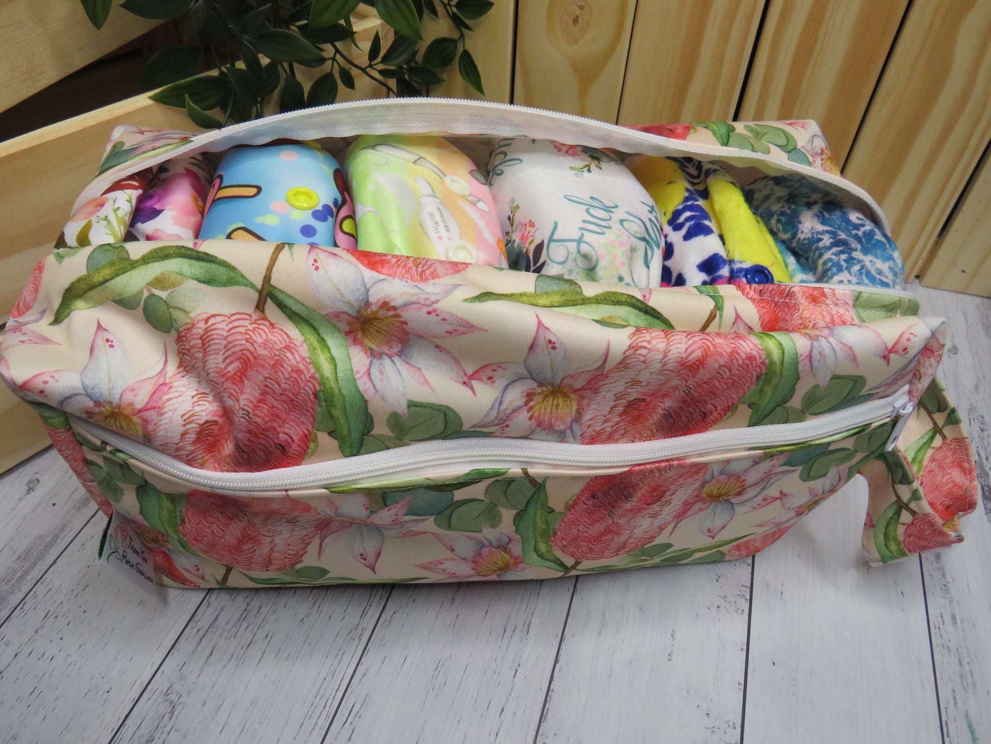Our nappy pods are a rectangular box shape that can comfortably fit 6 of our nappies, depending on which size you buy. They are perfect for short day trips, add in 3 nappies, some wipes, a change of pants and off you go. They are amazing to send to daycare, just stuff full of your clean nappies and single nappy wetbags and off you go!