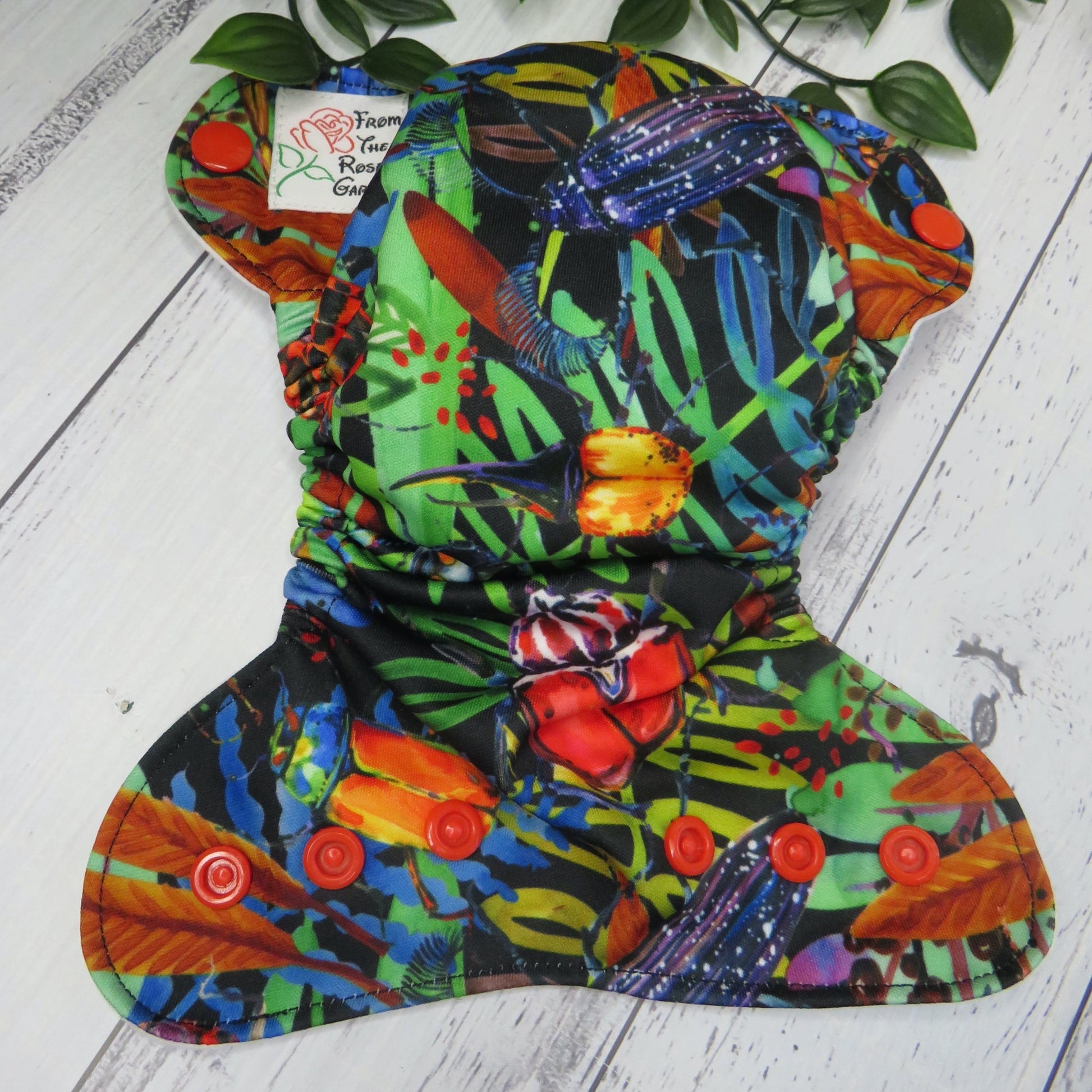 The outer layer of this nappy is PUL with a suede cloth inner, the insert is a fold over snake style insert composed of bamboo and topped with suede cloth to keep bub feeling nice and dry.