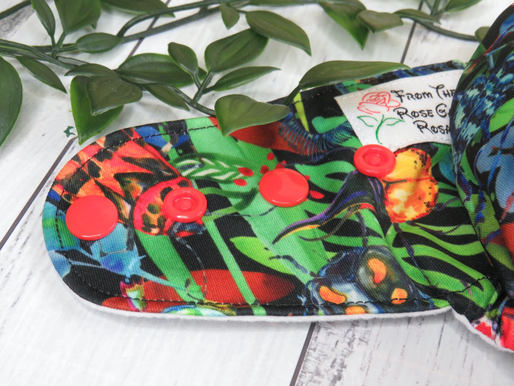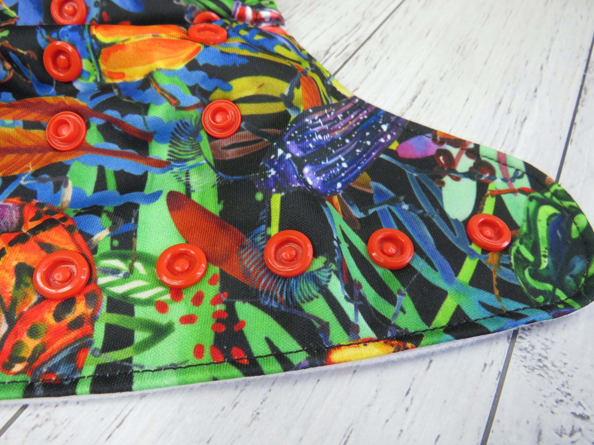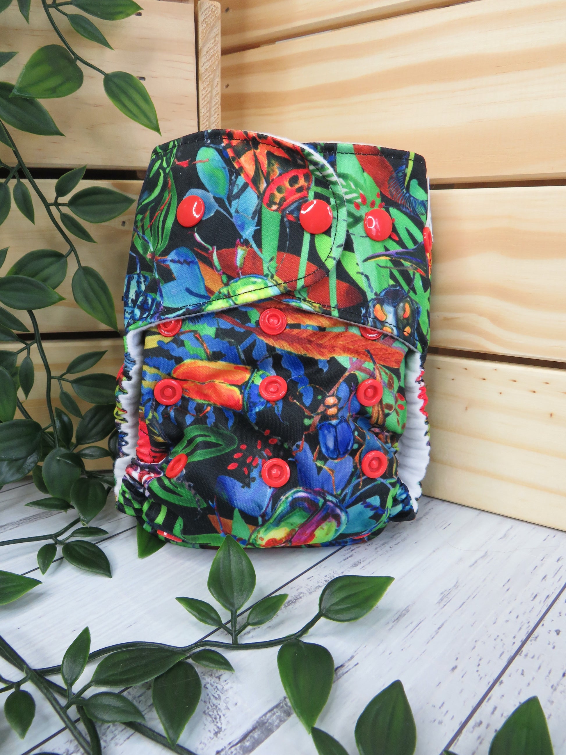 Each nappy comes with a snap in bamboo insert topped with suede cloth and a long bamboo snake insert that can be folded for where the absorbency is needed.