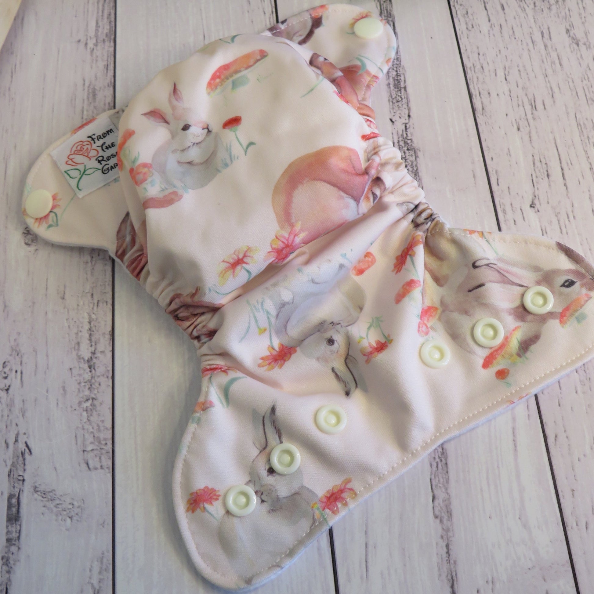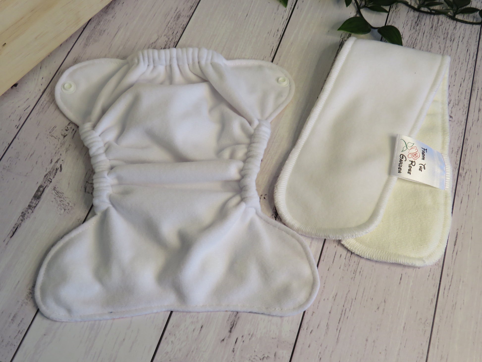 The outer layer of this nappy is PUL with a suede cloth inner, the insert is a fold over snake style insert composed of bamboo and topped with suede cloth to keep bub feeling nice and dry.