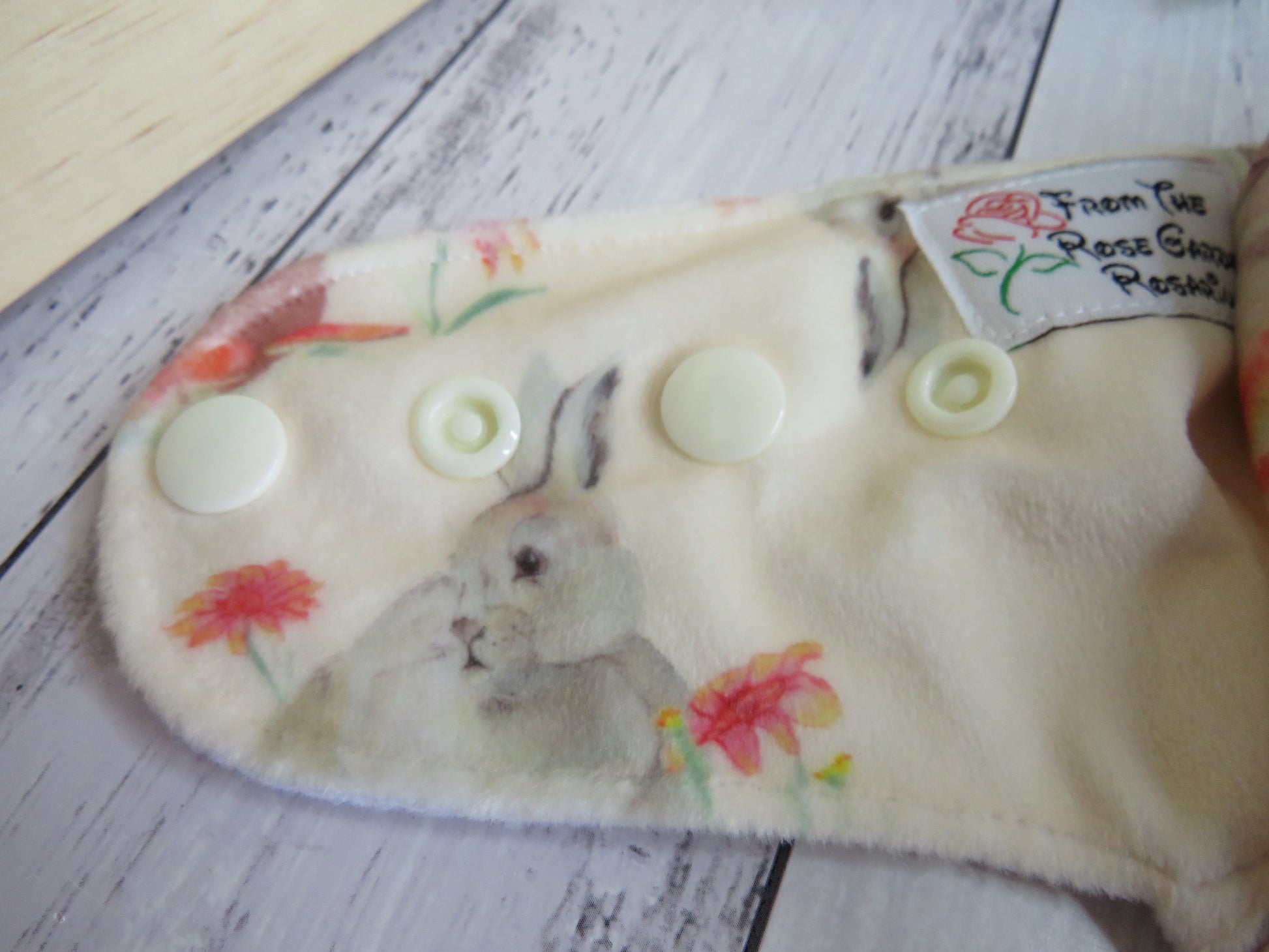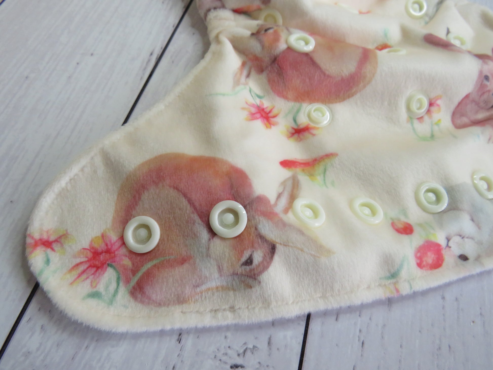 Each nappy comes with a snap in bamboo insert topped with suede cloth and a long bamboo snake insert that can be folded for where the absorbency is needed.