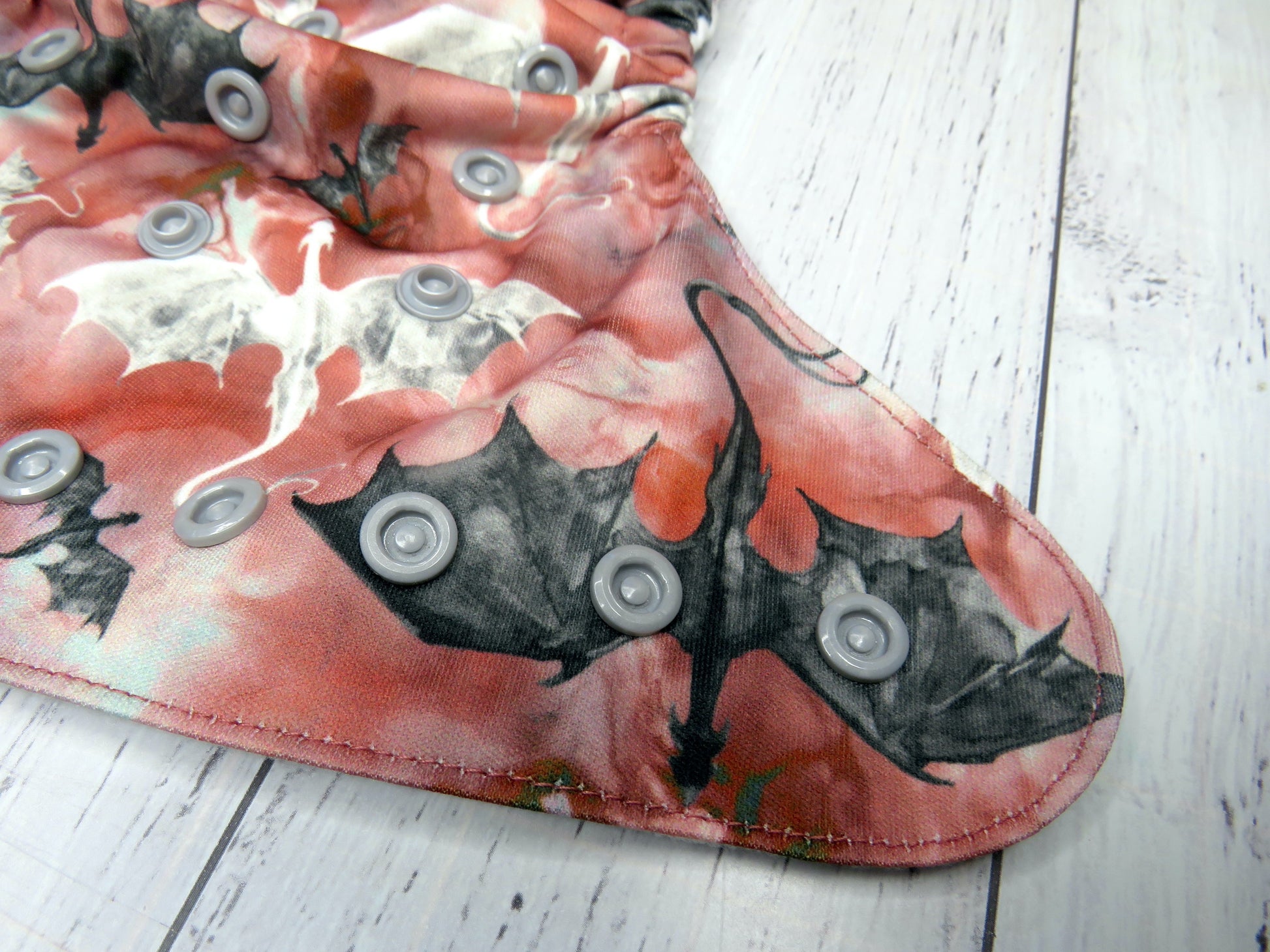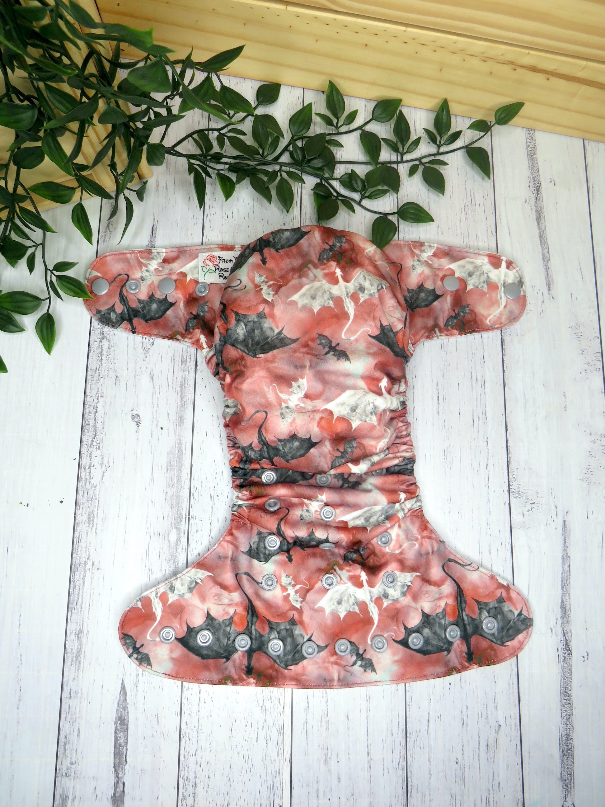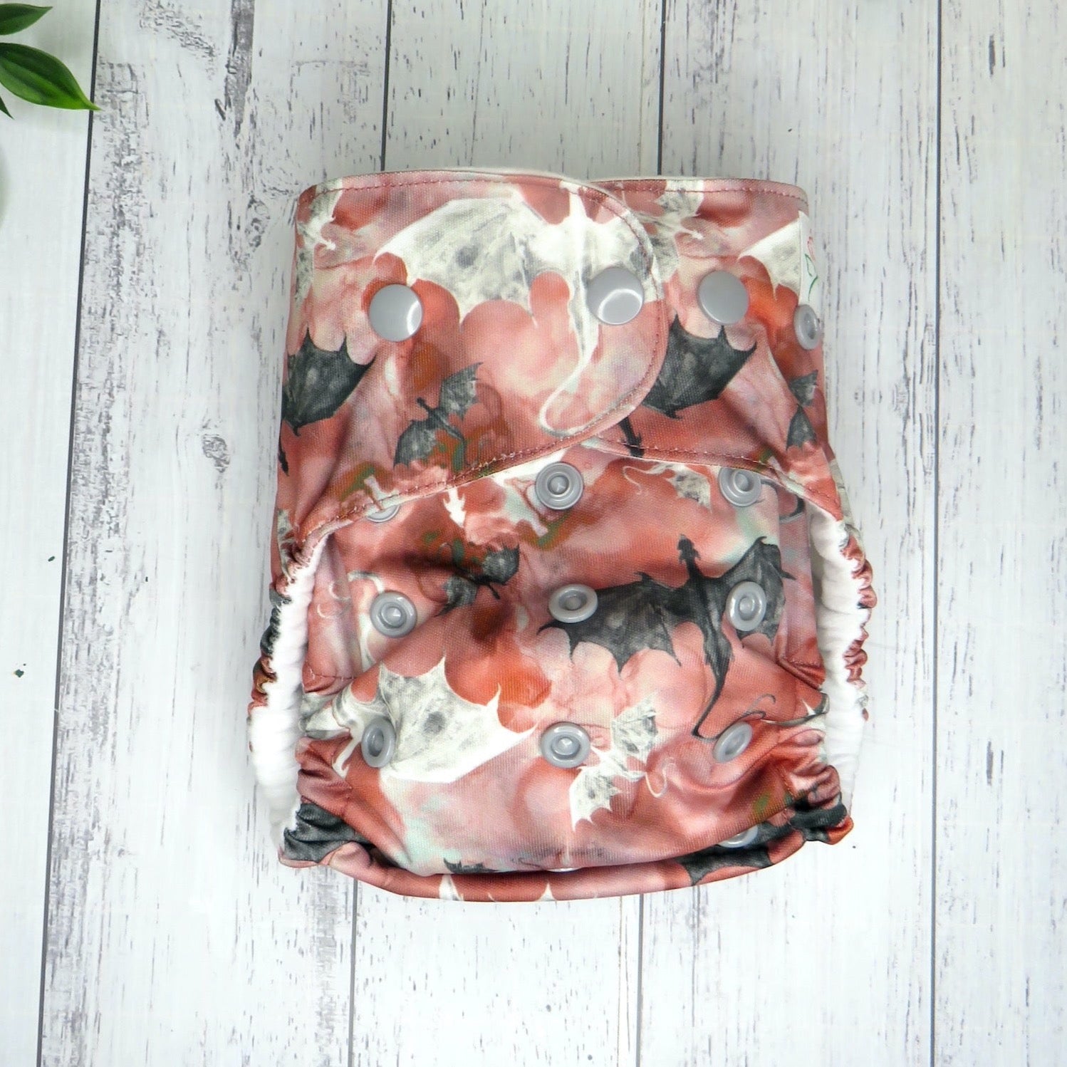 Each nappy comes with a snap in bamboo insert topped with suede cloth and a long bamboo snake insert that can be folded for where the absorbency is needed.