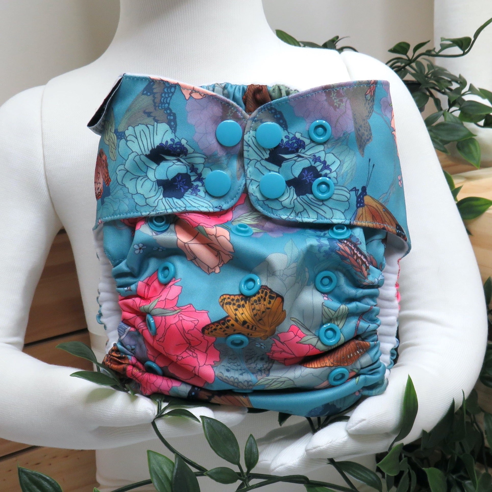 Our Double row front snapping cloth nappies are an All-In-Two style with 4 rise settings and are designed to fit from birth to toilet training (4-20kgs).