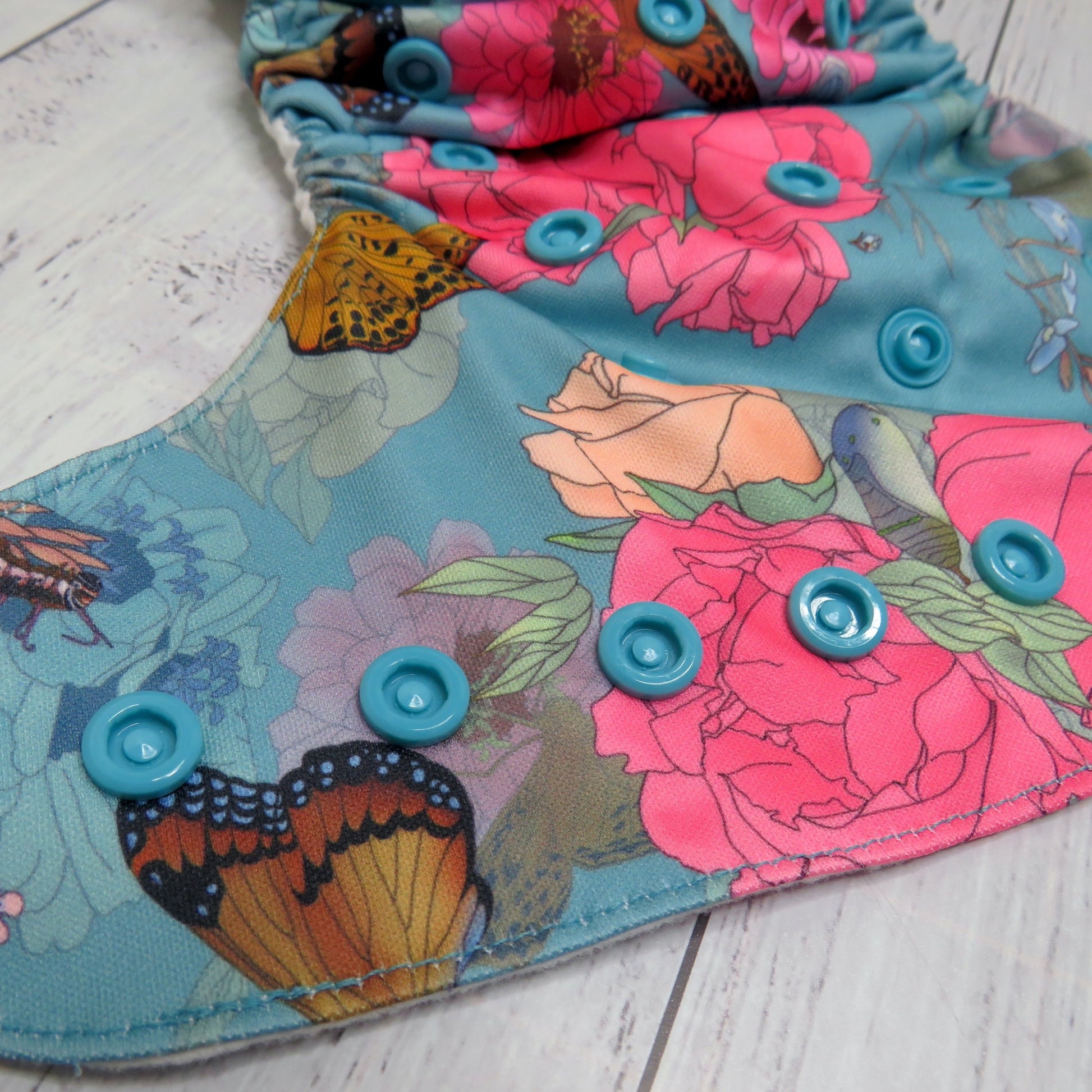 Each nappy comes with a snap in bamboo insert topped with suede cloth and a long bamboo snake insert that can be folded for where the absorbency is needed.