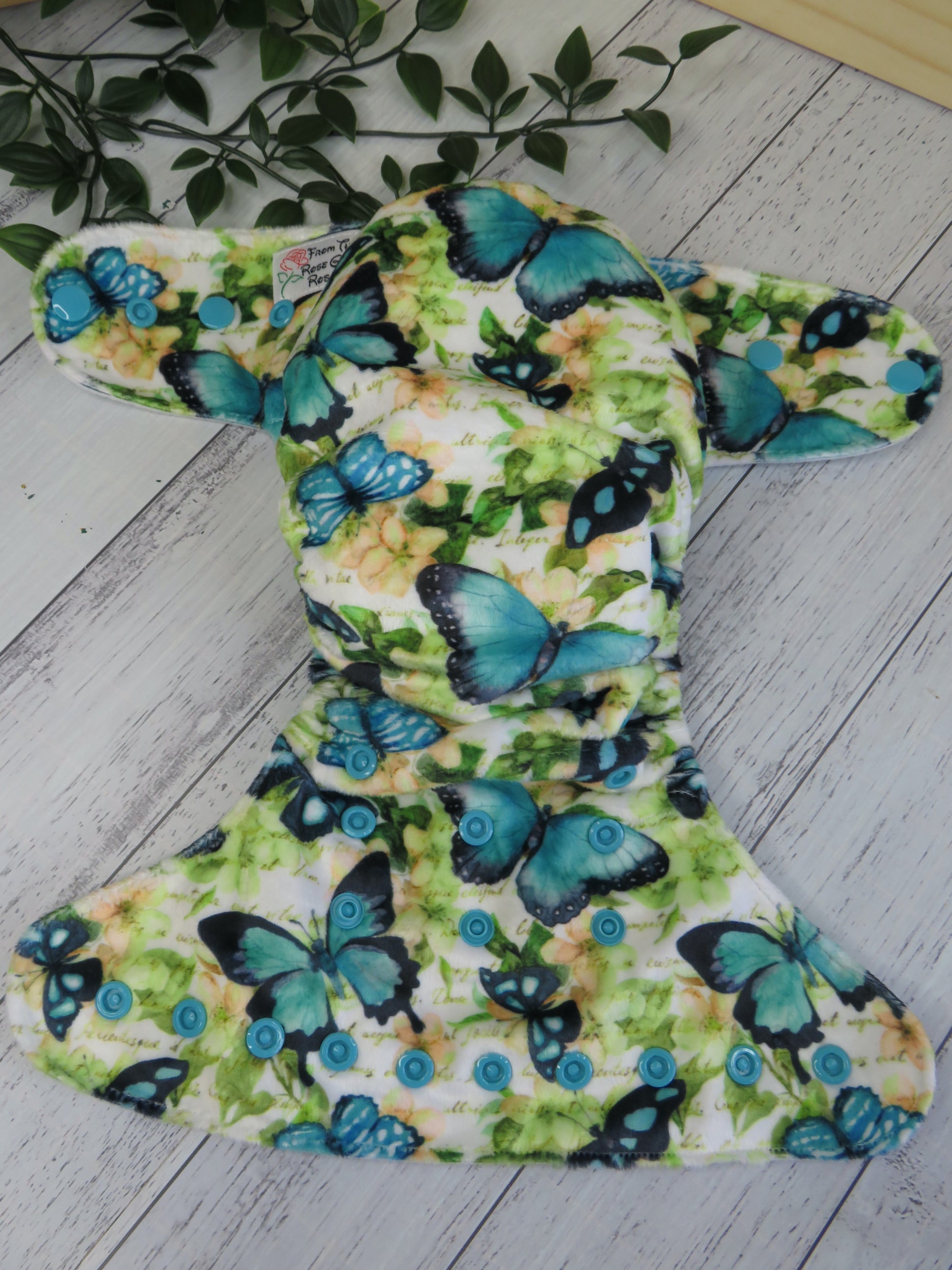 Each nappy comes with a snap in bamboo insert topped with suede cloth and a long bamboo snake insert that can be folded for where the absorbency is needed.