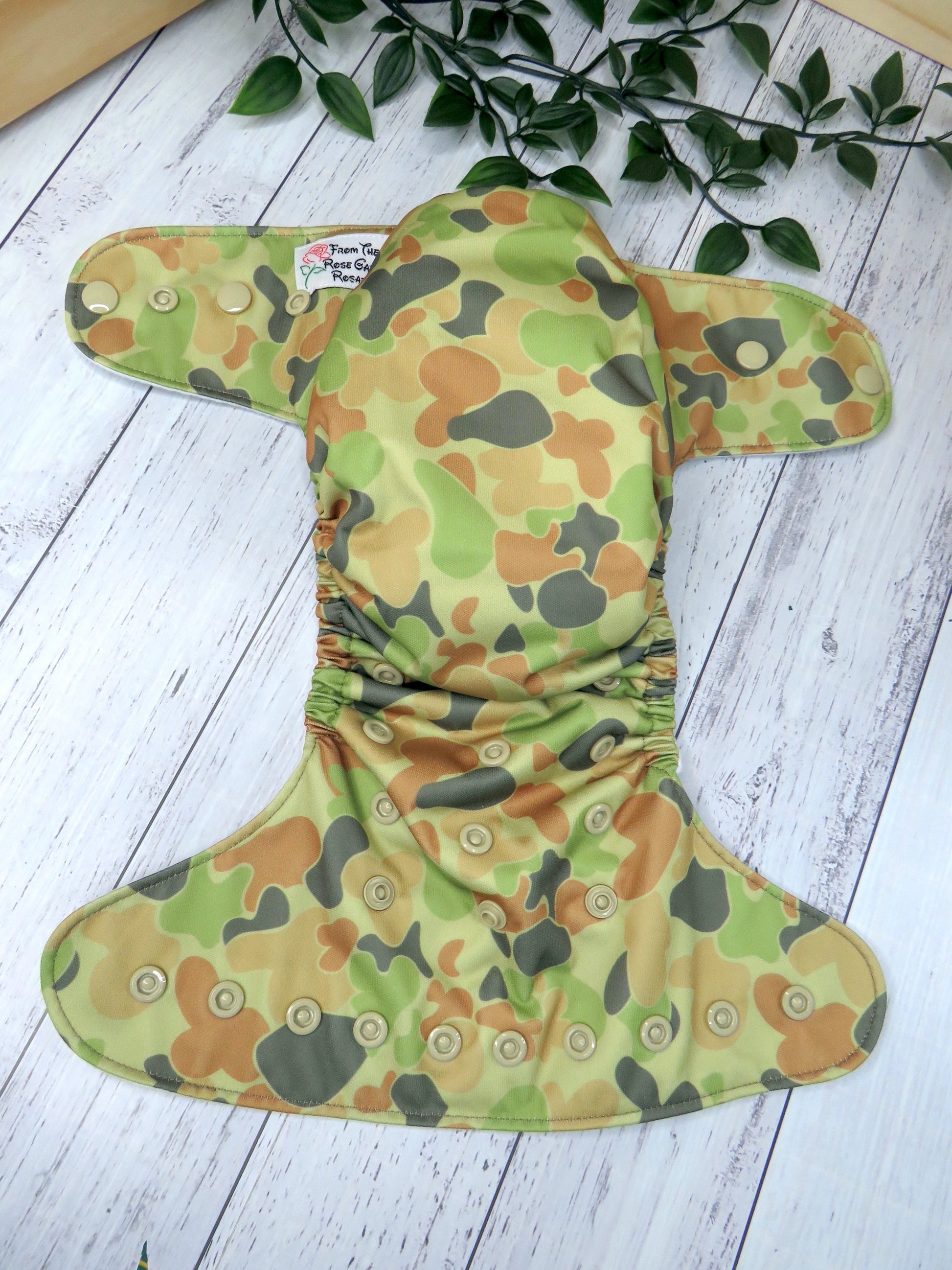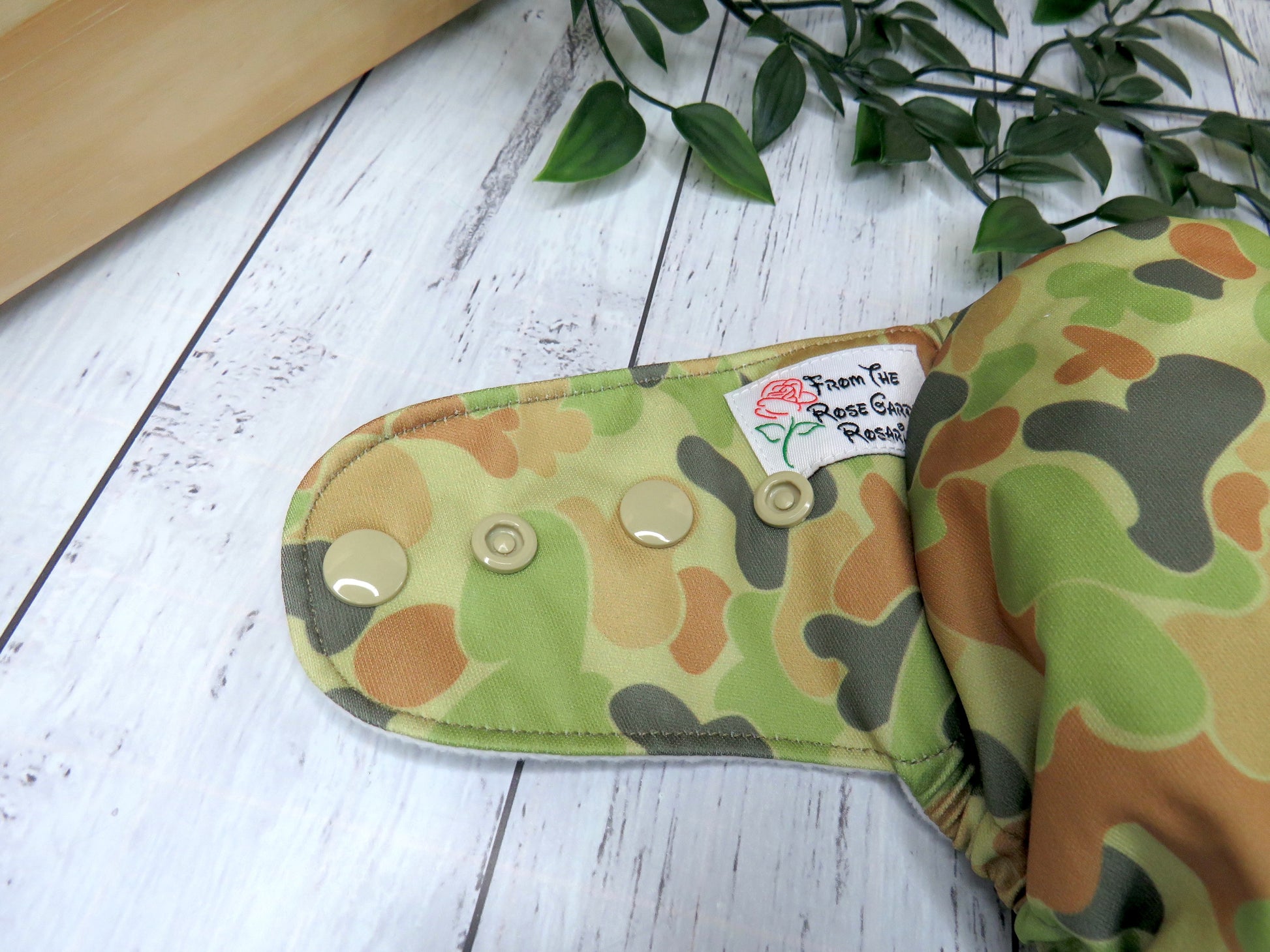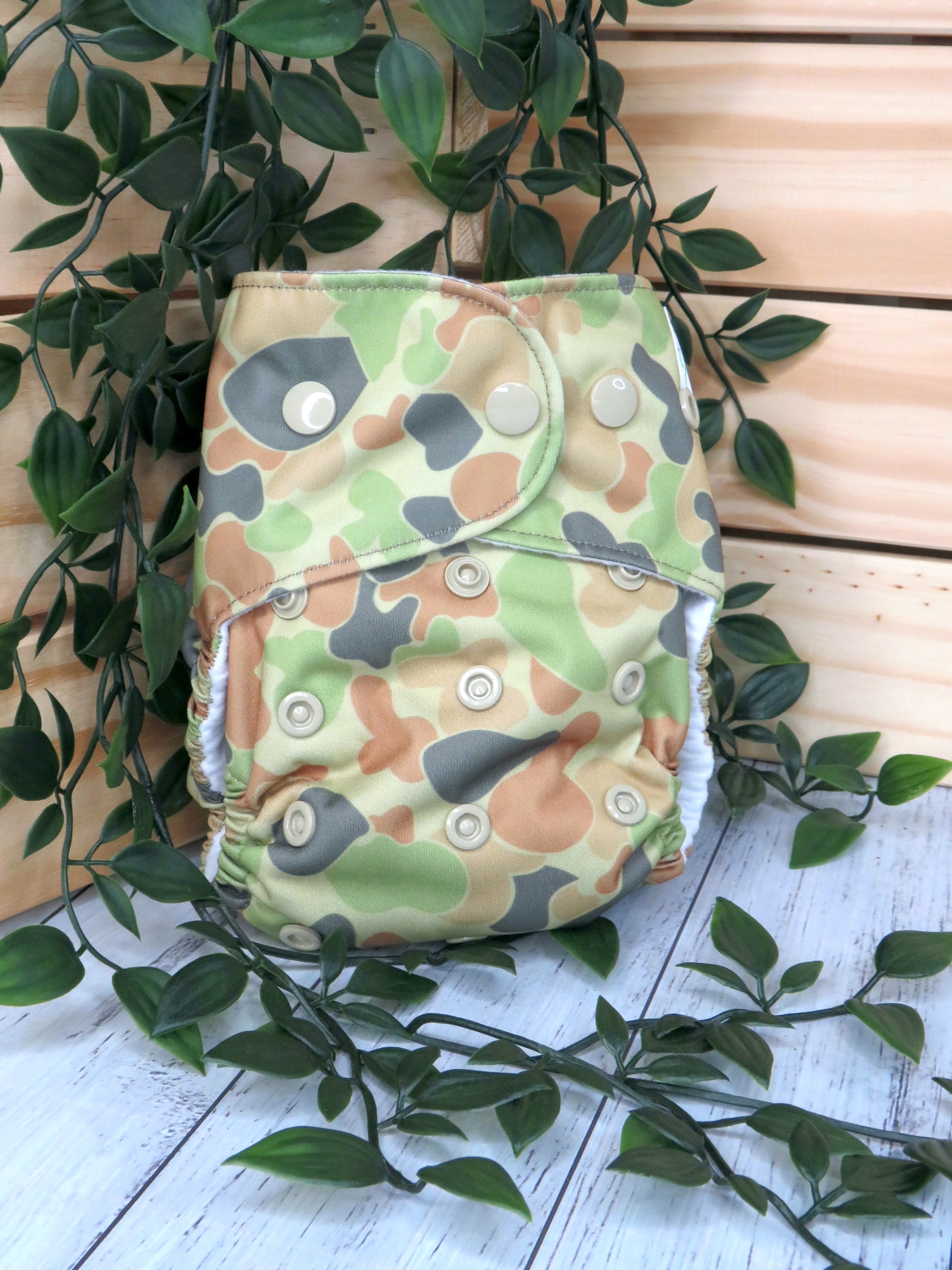 Each nappy comes with a snap in bamboo insert topped with suede cloth and a long bamboo snake insert that can be folded for where the absorbency is needed.