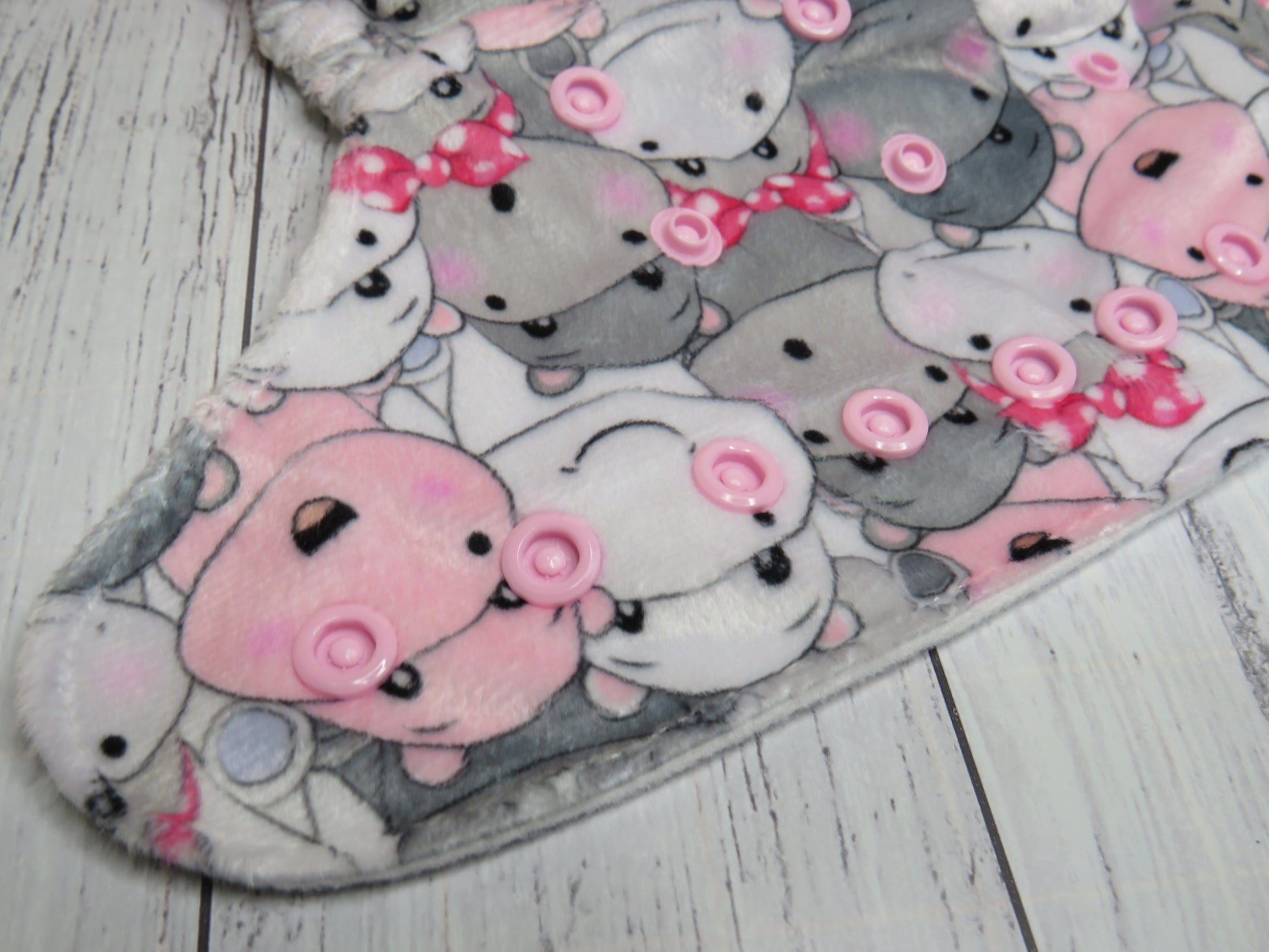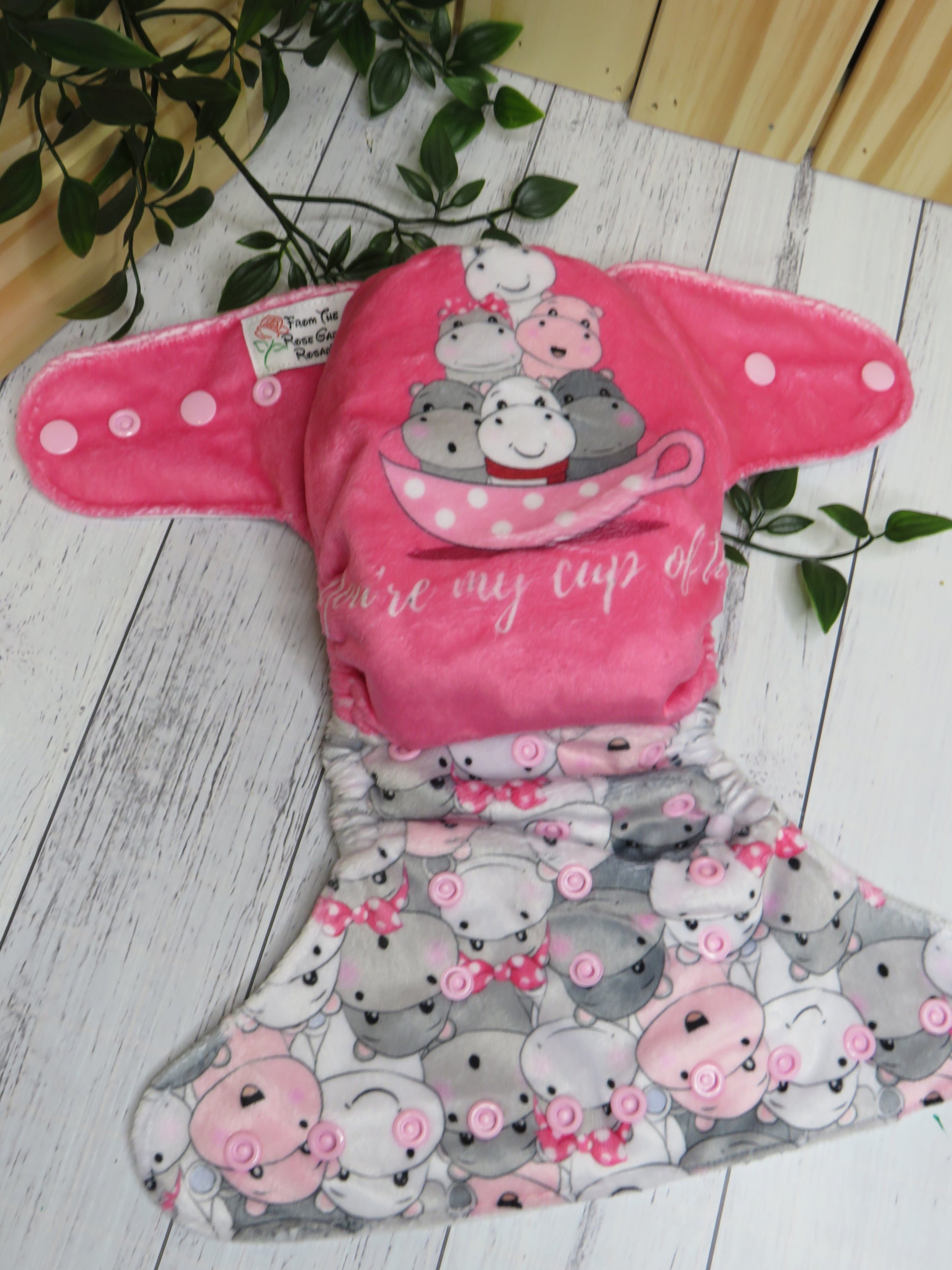 Each nappy comes with a snap in bamboo insert topped with suede cloth and a long bamboo snake insert that can be folded for where the absorbency is needed.