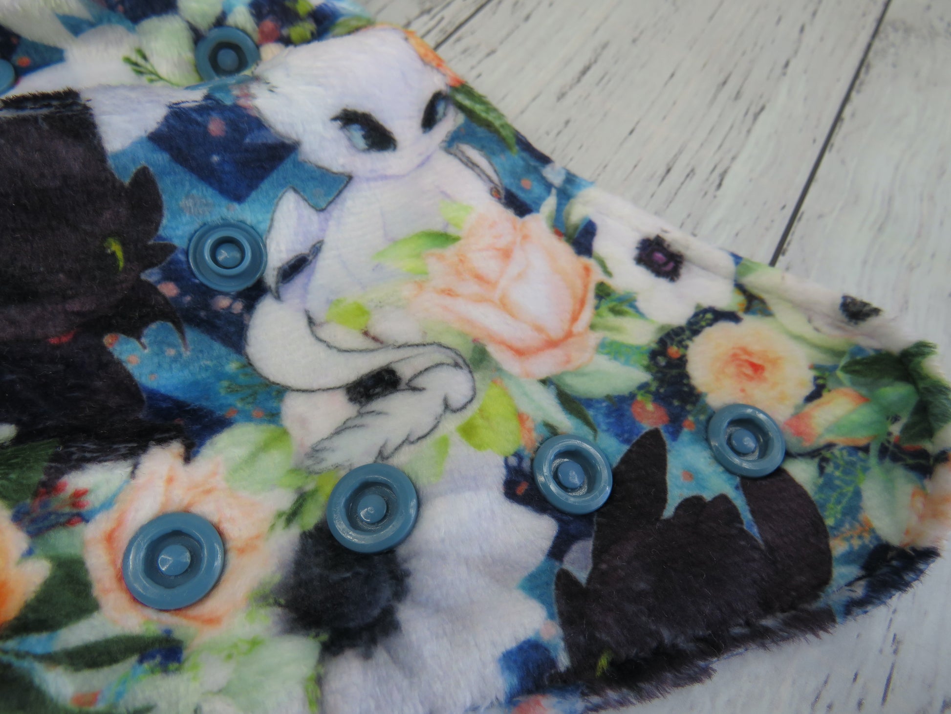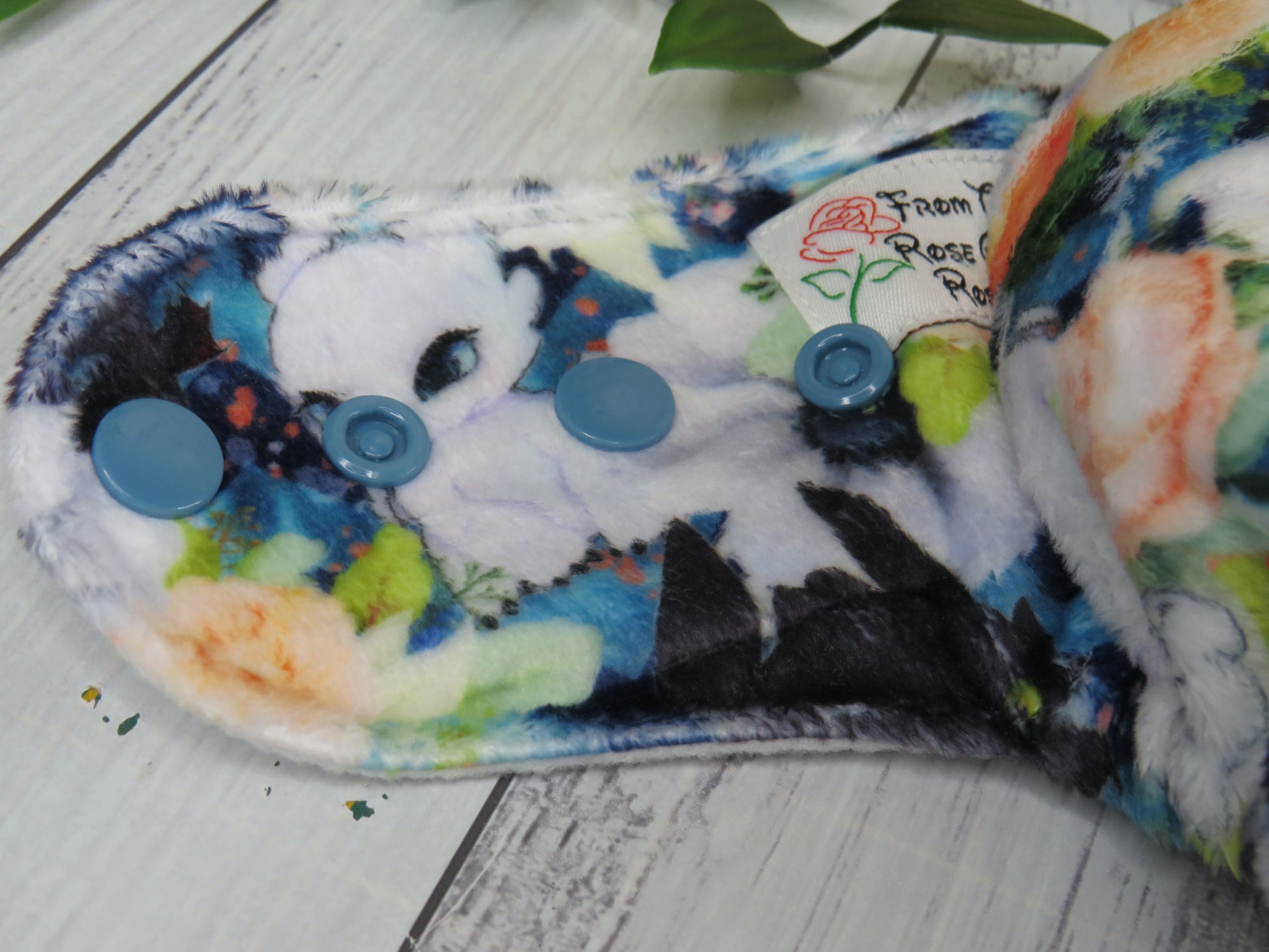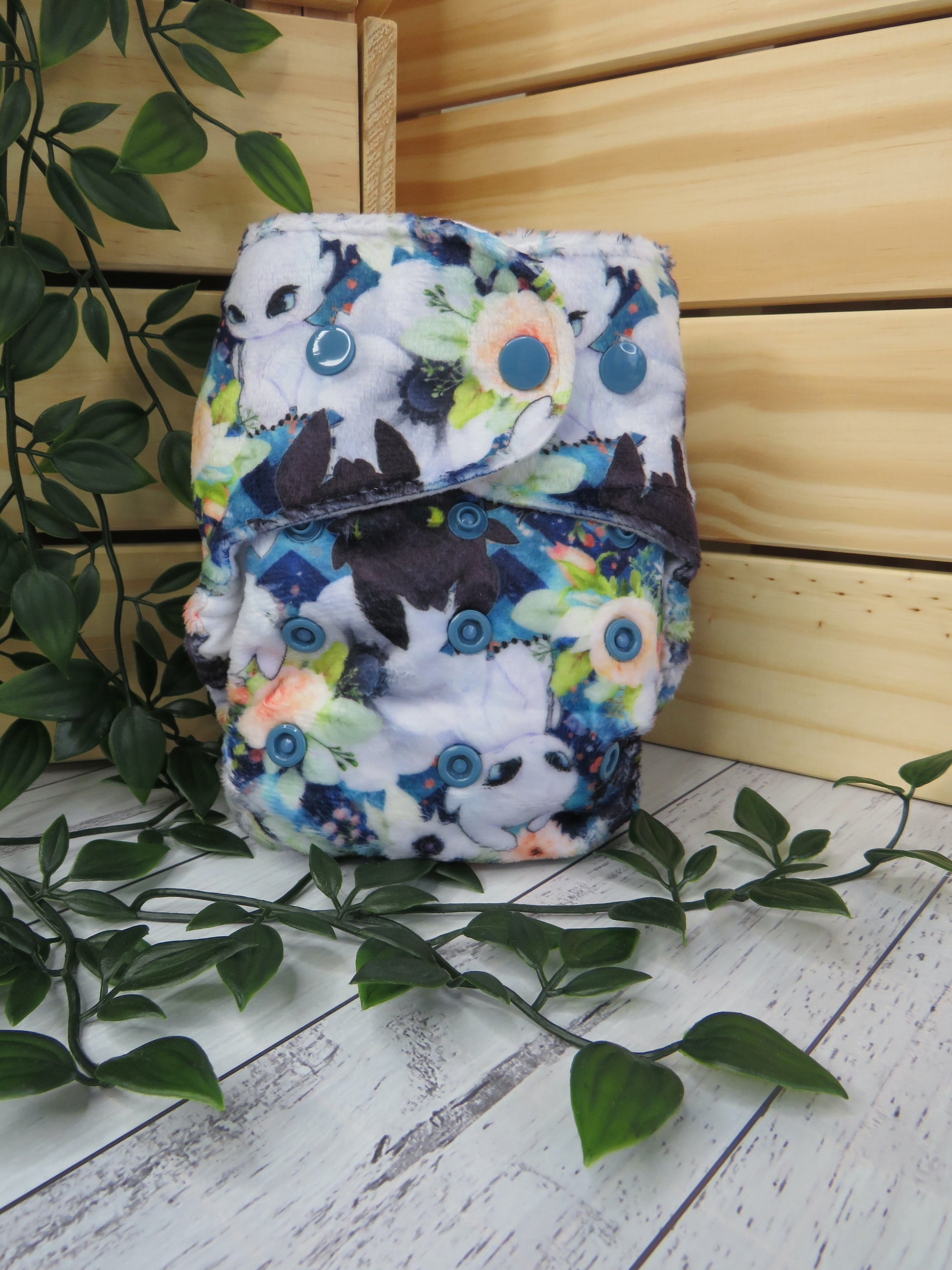 Each nappy comes with a snap in bamboo insert topped with suede cloth and a long bamboo snake insert that can be folded for where the absorbency is needed.