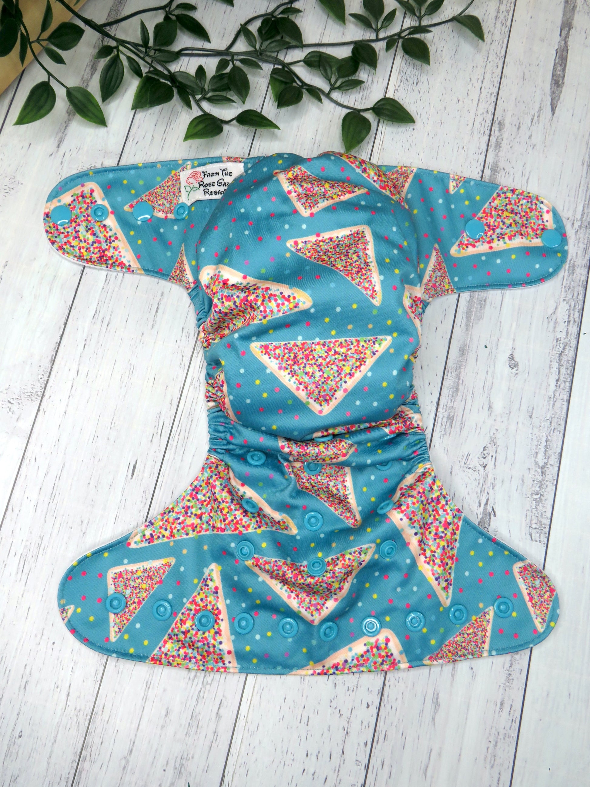 Each nappy comes with a snap in bamboo insert topped with suede cloth and a long bamboo snake insert that can be folded for where the absorbency is needed.