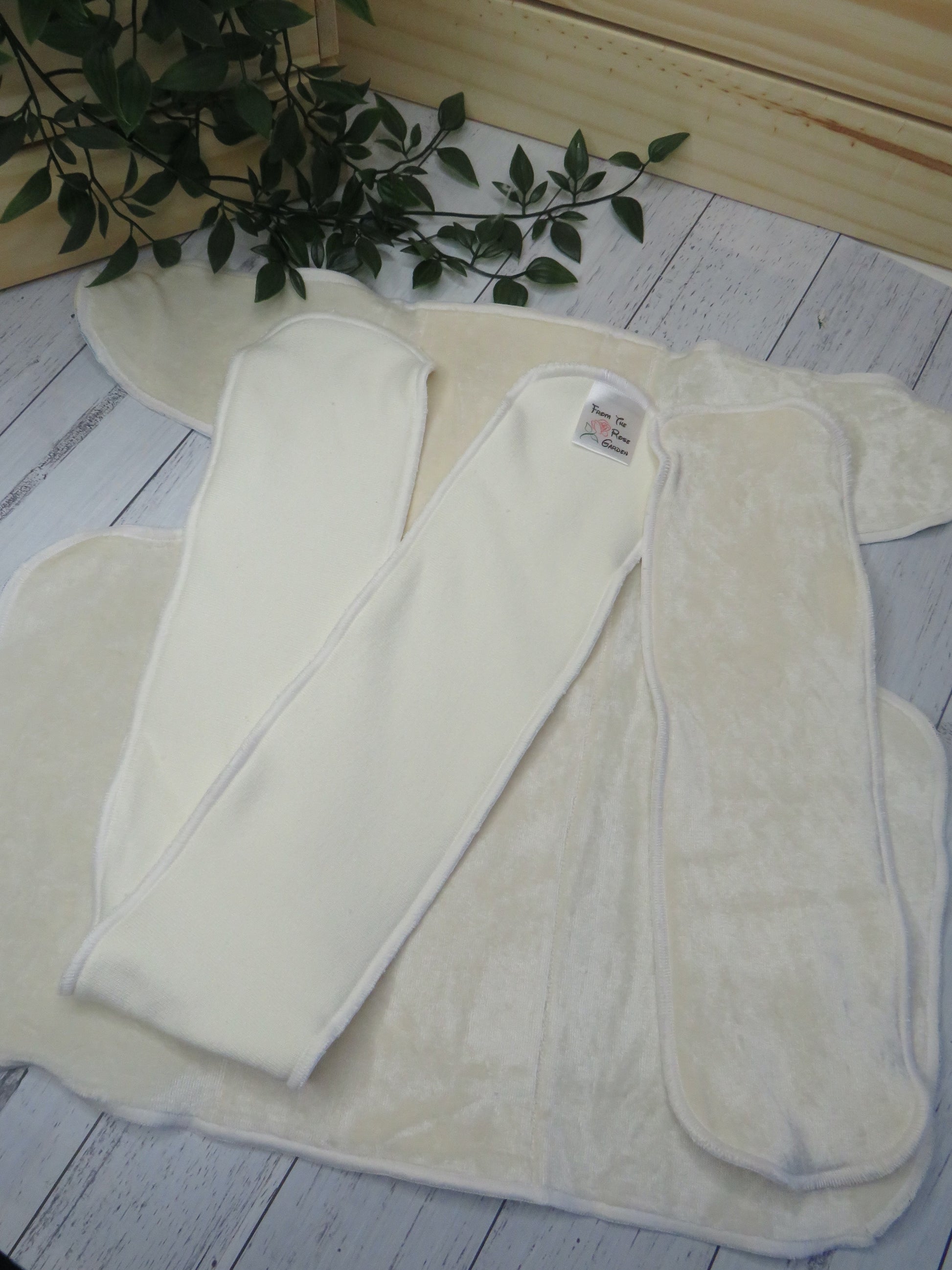 Each Preflat comes with a long bamboo snake insert (similar to our daytime nappies) which can be folded in many many different ways to increase the absorbency where your little one requires it, as well as a bamboo booster thats topped with soft bamboo velour which acts as a stay dry layer.