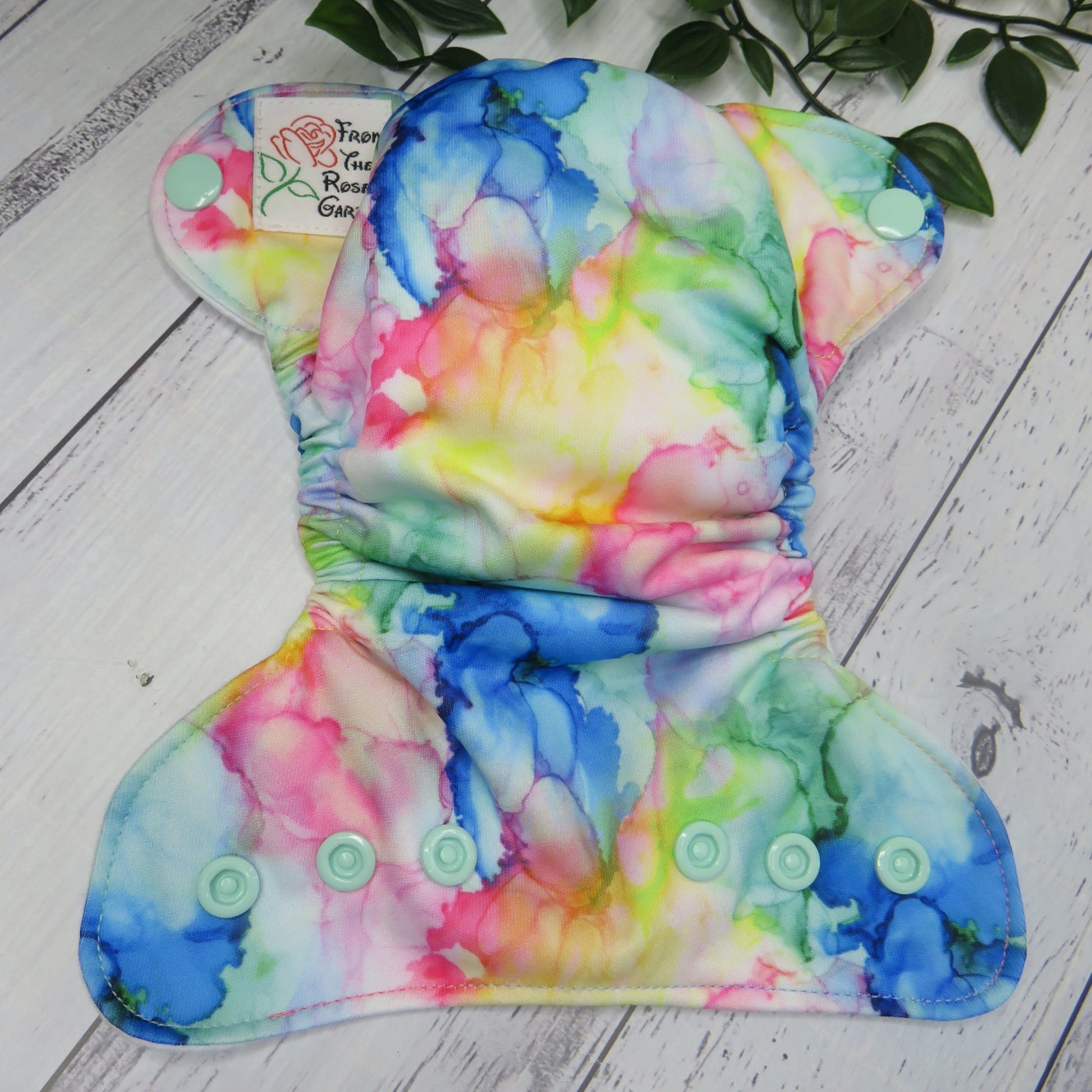 The outer layer of this nappy is PUL with a suede cloth inner, the insert is a fold over snake style insert composed of bamboo and topped with suede cloth to keep bub feeling nice and dry.