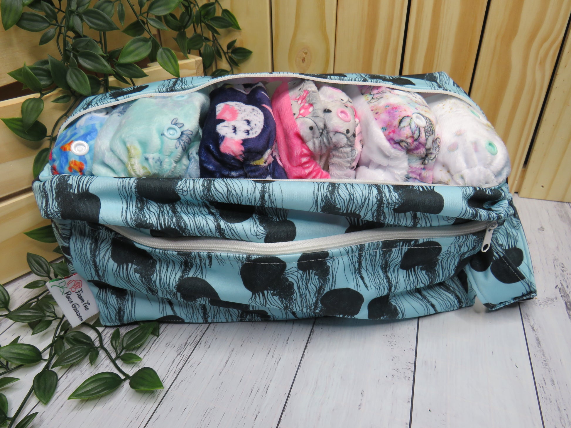 Our nappy pods are a rectangular box shape that can comfortably fit 6 of our nappies, depending on which size you buy. They are perfect for short day trips, add in 3 nappies, some wipes, a change of pants and off you go. They are amazing to send to daycare, just stuff full of your clean nappies and single nappy wetbags and off you go!