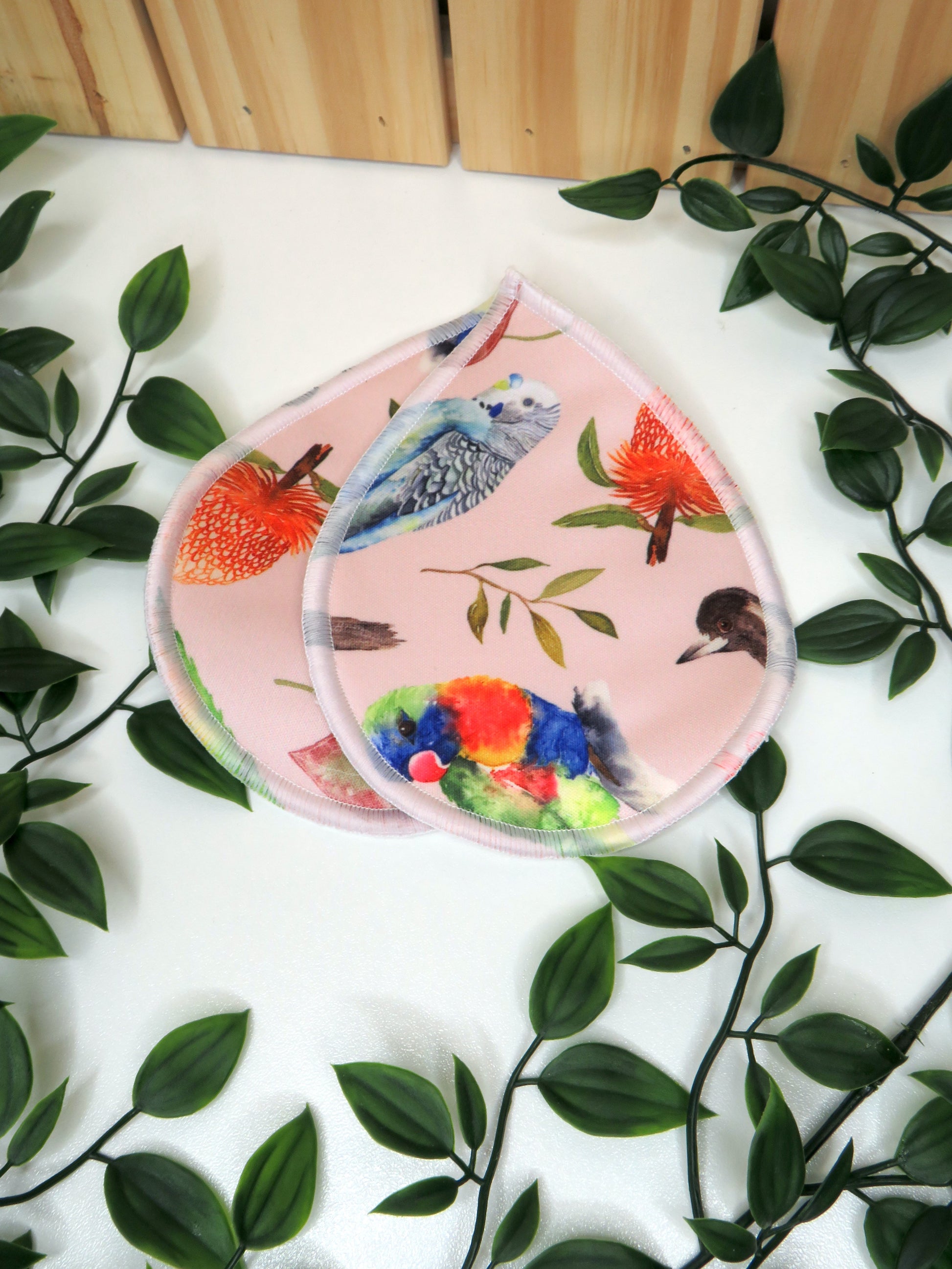 Breast pads are backed with printed PUL, have a bamboo core and are topped with a lovely soft natural bamboo velour.