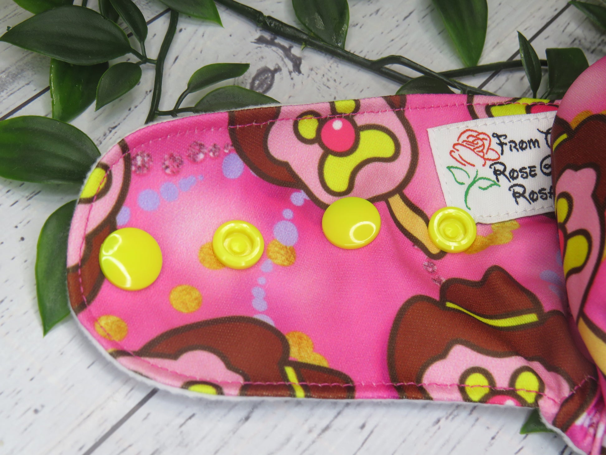 Each nappy comes with a snap in bamboo insert topped with suede cloth and a long bamboo snake insert that can be folded for where the absorbency is needed.