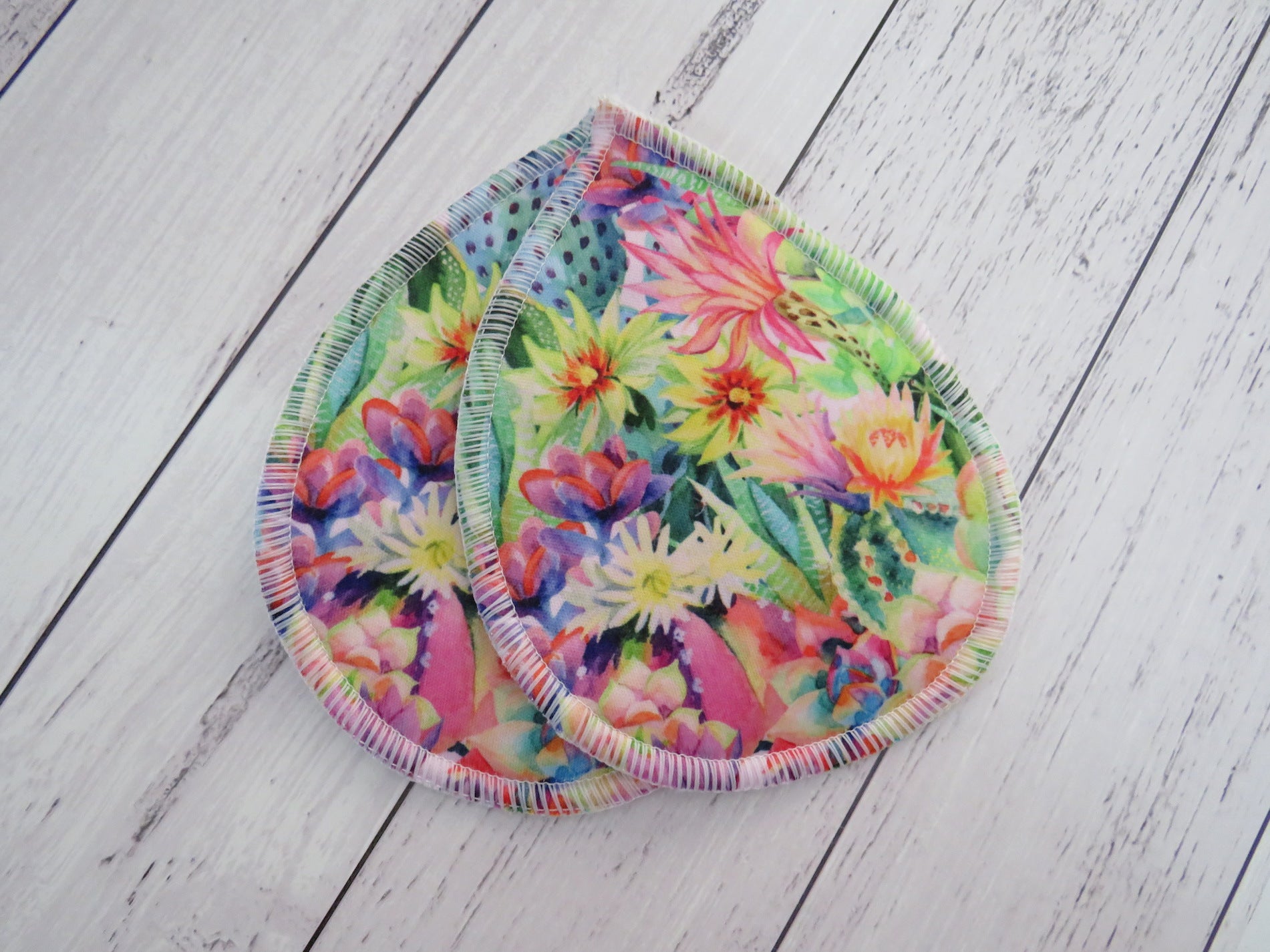 Breast pads are backed with printed PUL, have a bamboo fleece core and are topped with velour.