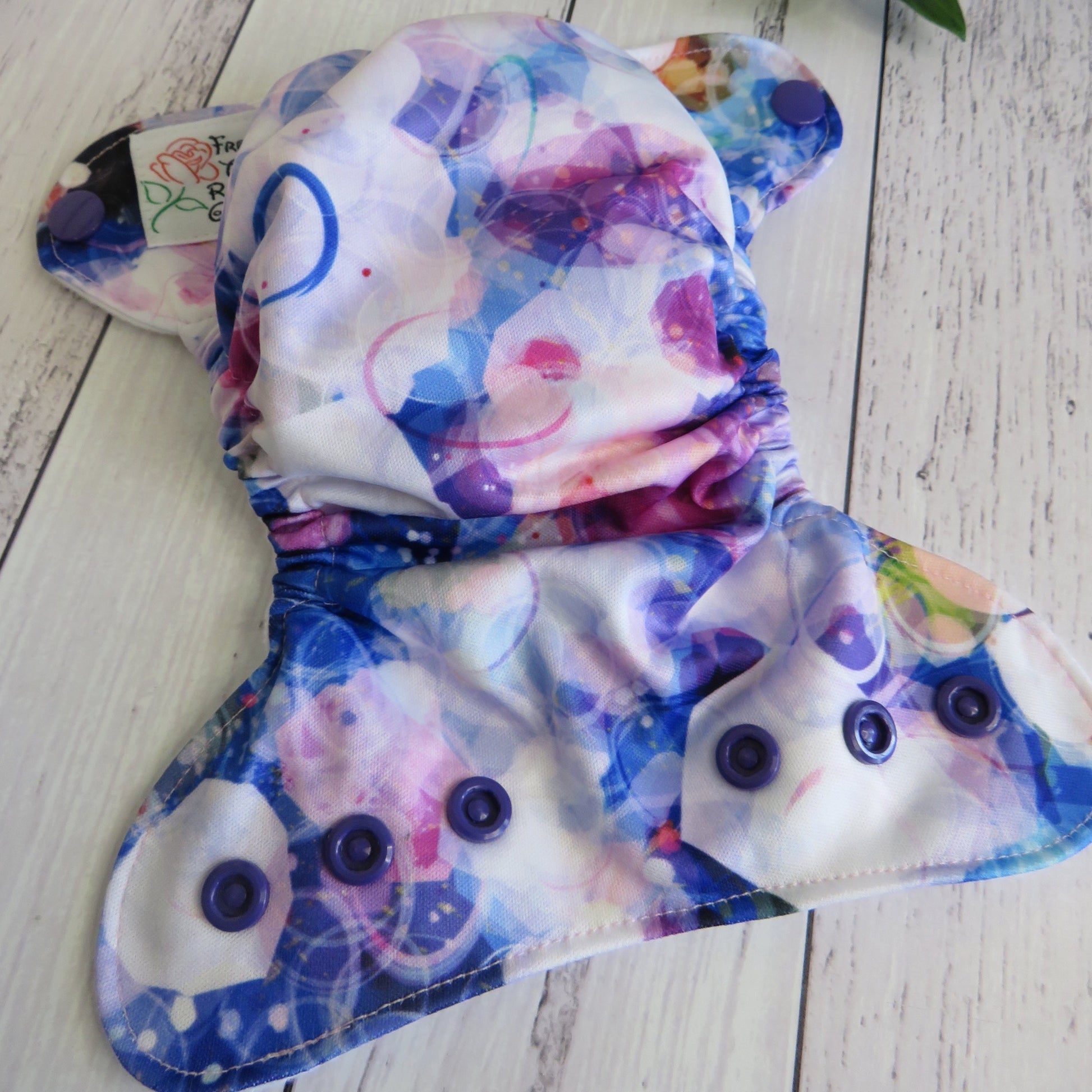 The outer layer of this nappy is PUL with a suede cloth inner, the insert is a fold over snake style insert composed of bamboo and topped with suede cloth to keep bub feeling nice and dry.