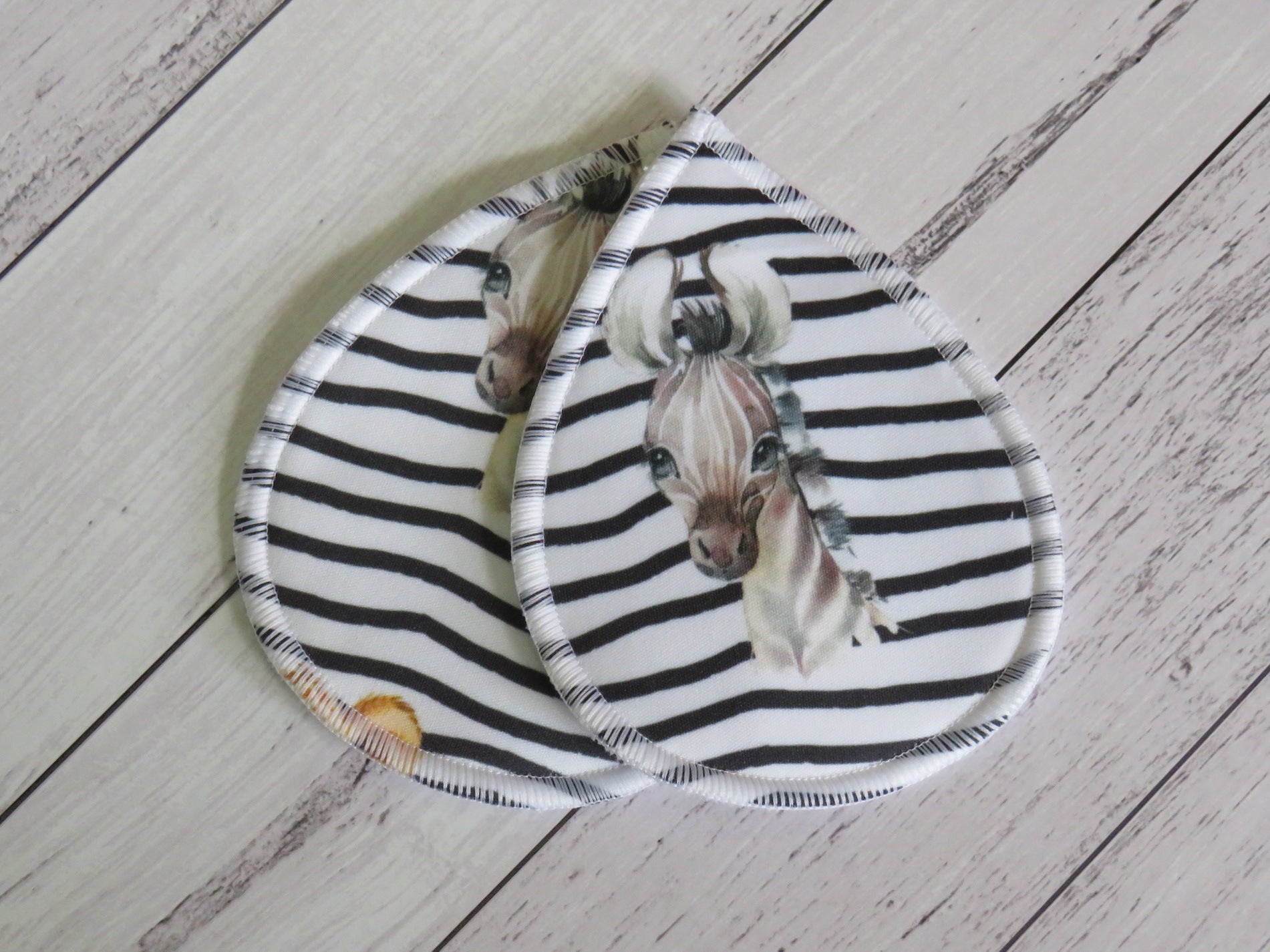 Breast pads are backed with printed PUL, have a bamboo fleece core and are topped with cotton velour.