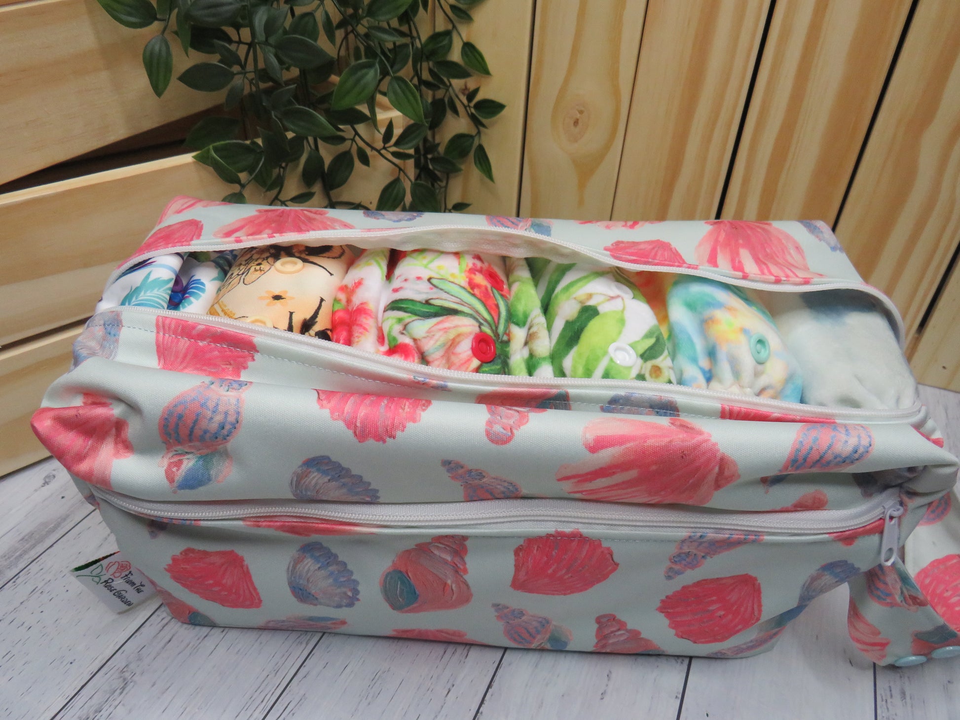 Our nappy pods are a rectangular box shape that can comfortably fit 6 of our nappies, depending on which size you buy. They are perfect for short day trips, add in 3 nappies, some wipes, a change of pants and off you go. They are amazing to send to daycare, just stuff full of your clean nappies and single nappy wetbags and off you go!