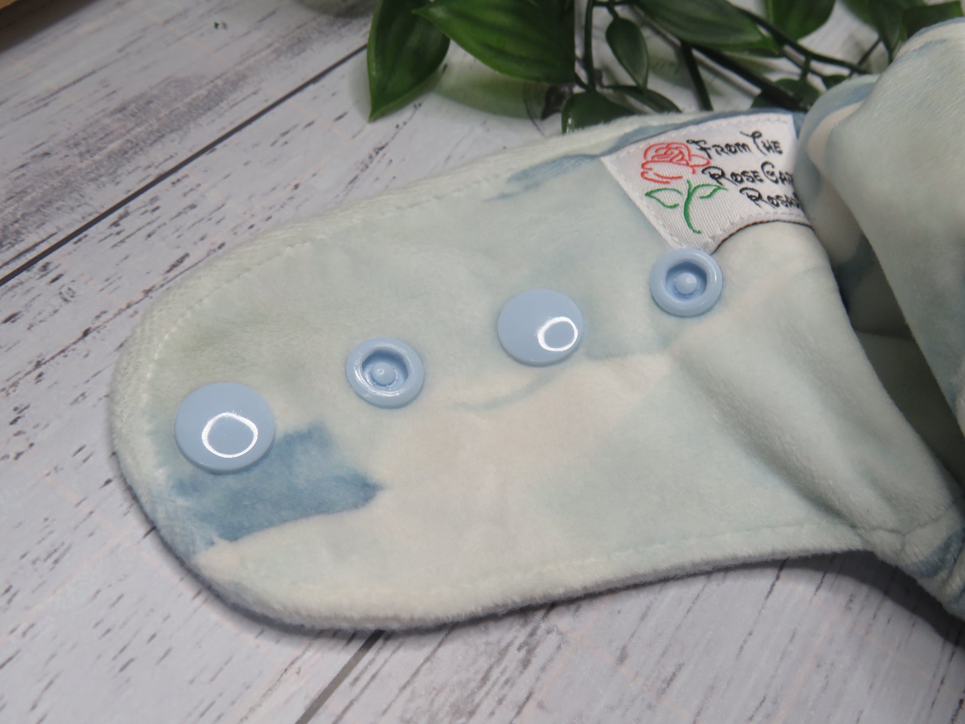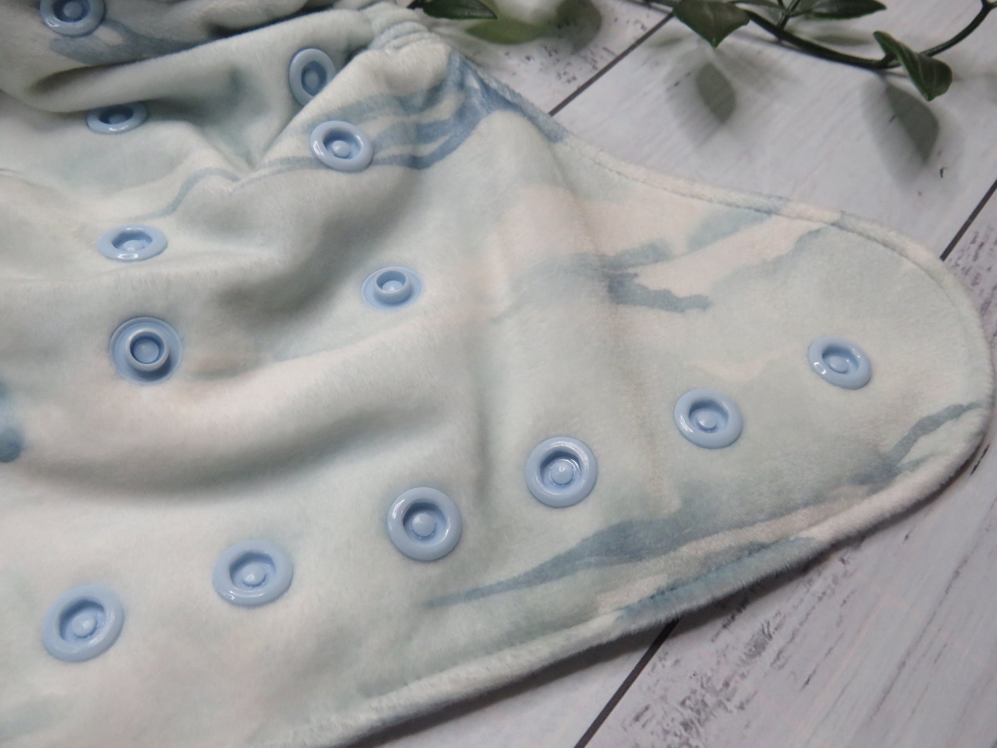Each nappy comes with a snap in bamboo insert topped with suede cloth and a long bamboo snake insert that can be folded for where the absorbency is needed.