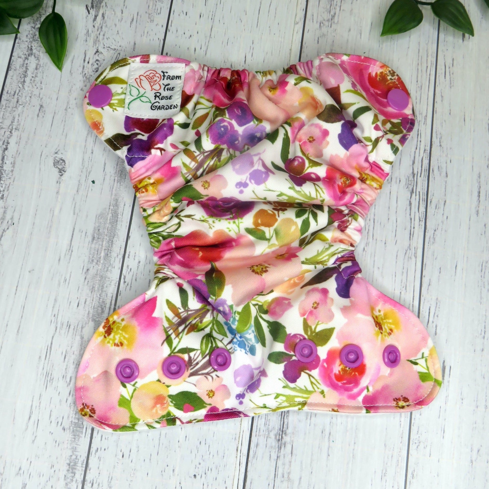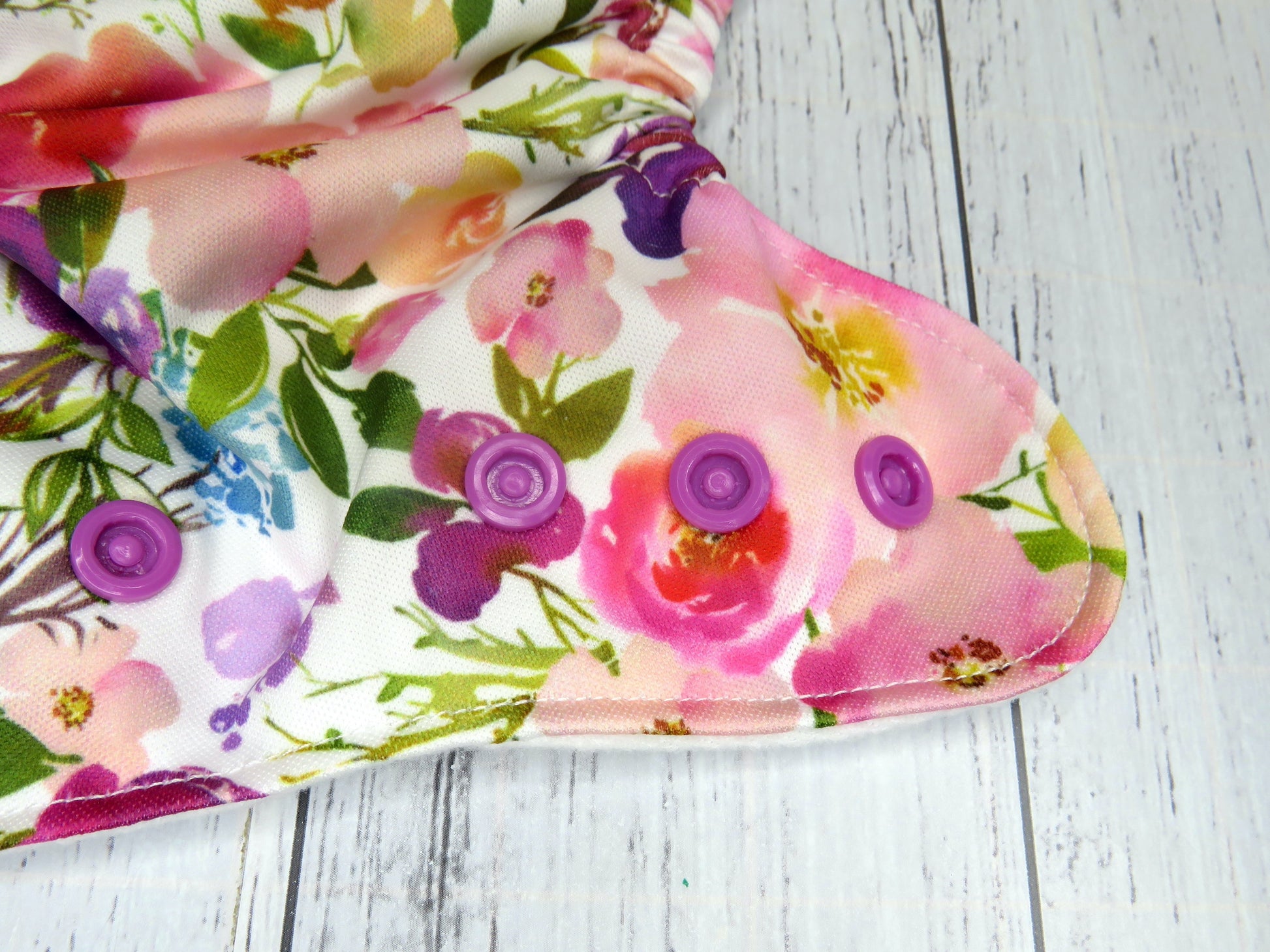 The outer layer of this nappy is PUL with a suede cloth inner, the insert is a fold over snake style insert composed of bamboo and topped with suede cloth to keep bub feeling nice and dry.