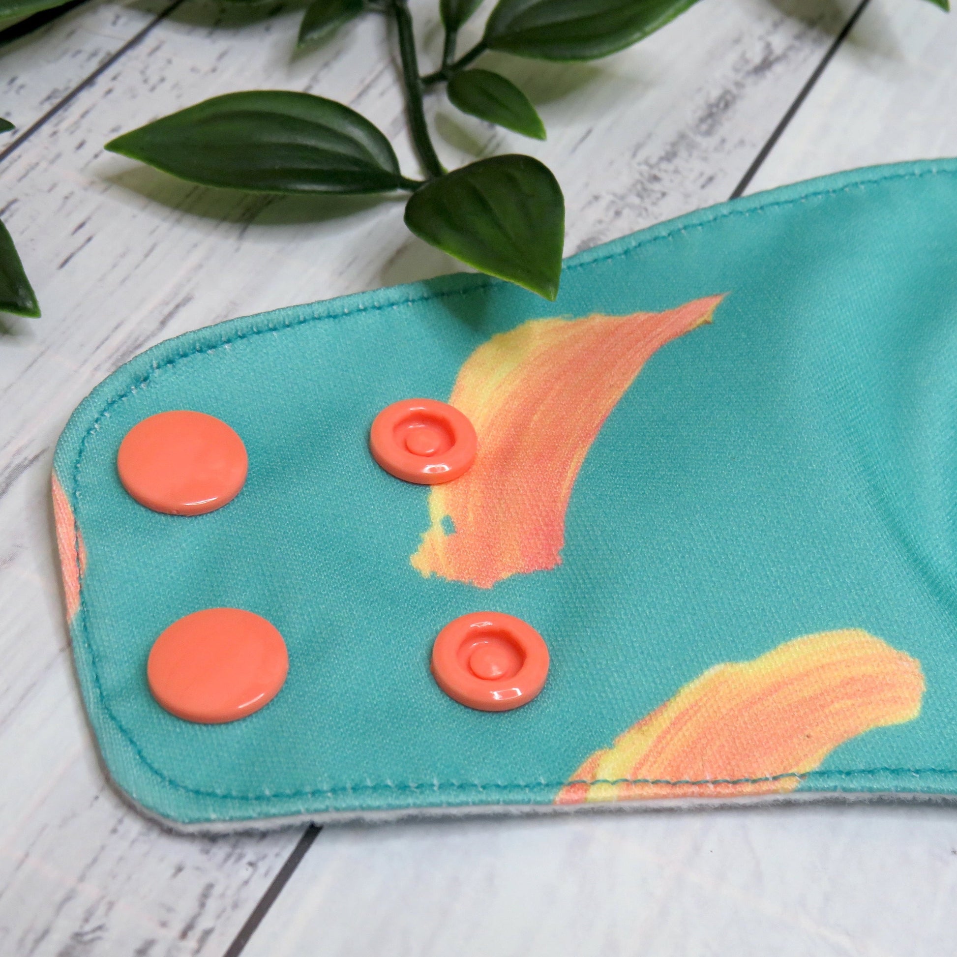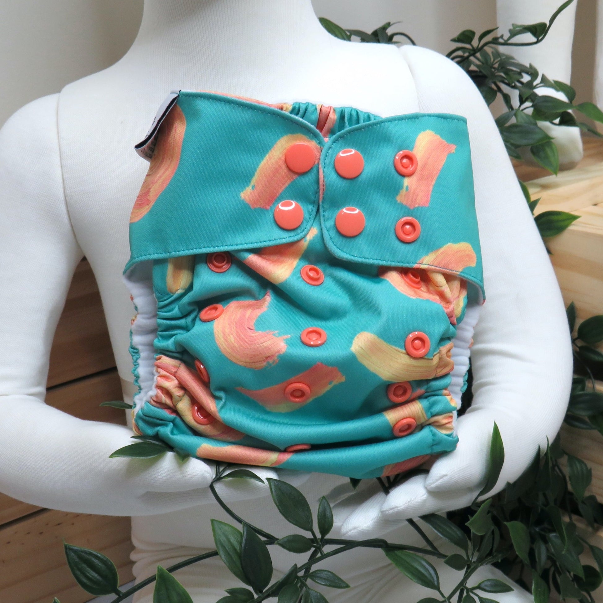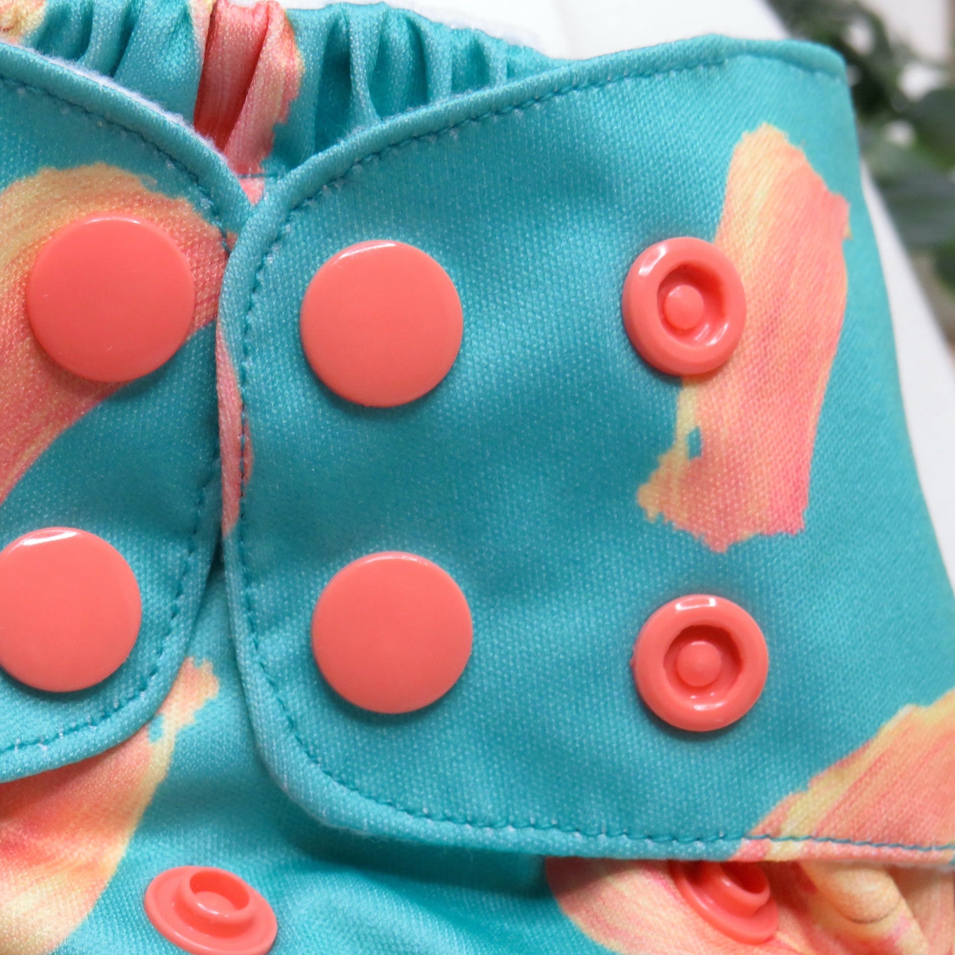 Our Double row front snapping cloth nappies are an All-In-Two style with 4 rise settings and are designed to fit from birth to toilet training (4-20kgs).